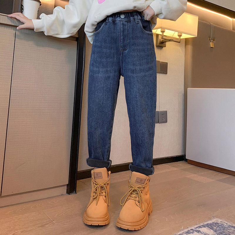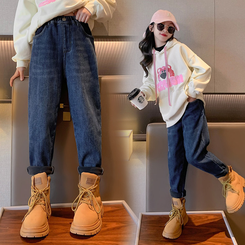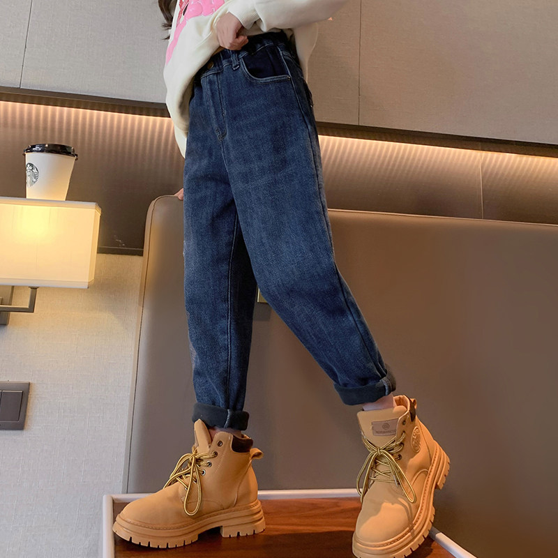 Girl pants autumn and winter style integrated suede outside wearing female big boy new 2023 Winter children Cavet Thickened Jeans-Taobao