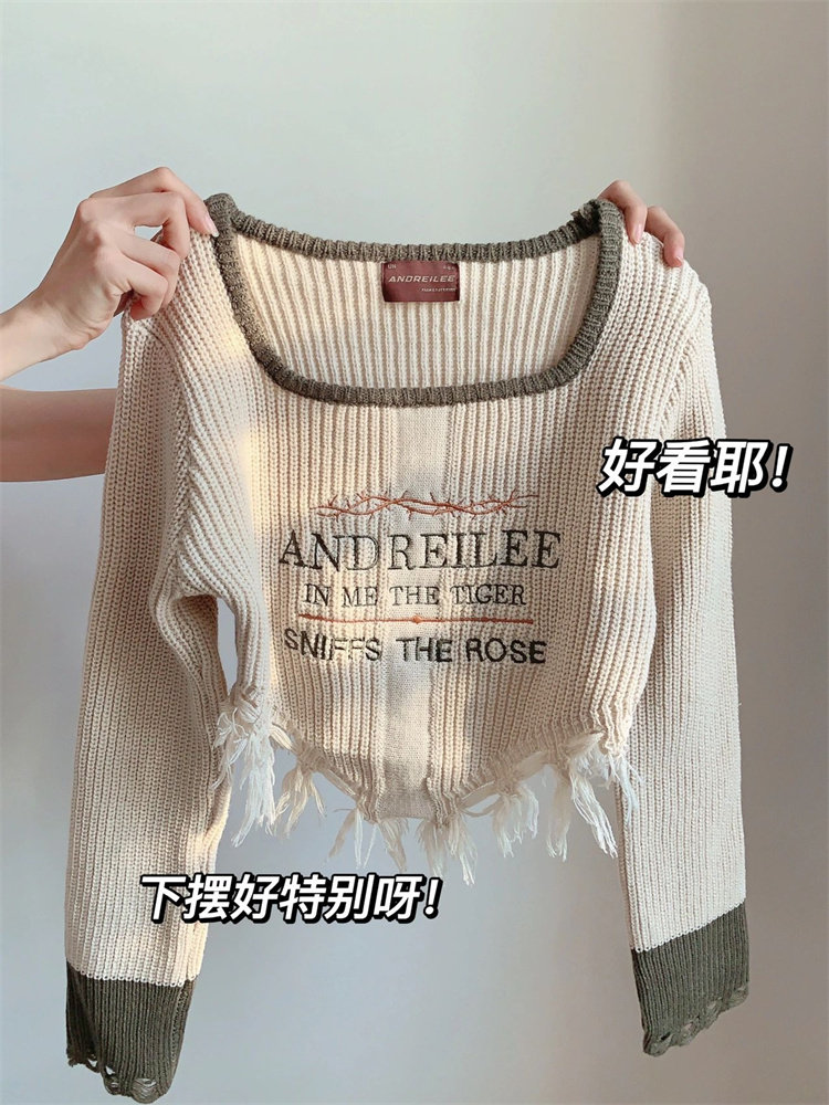 American vintage square frontage Fried Street Knit Long Sleeves Women Spring Autumn New Foreign Air Design Sensation with a small crowd of short blouses-Taobao