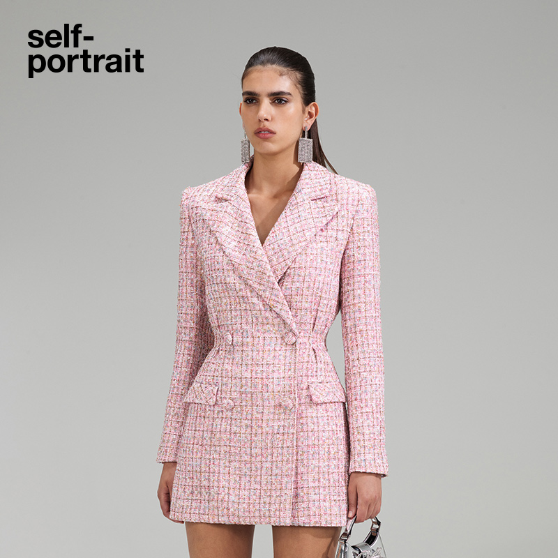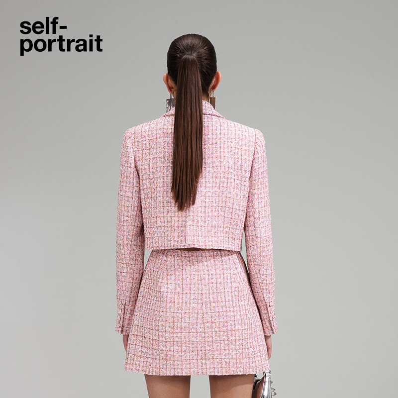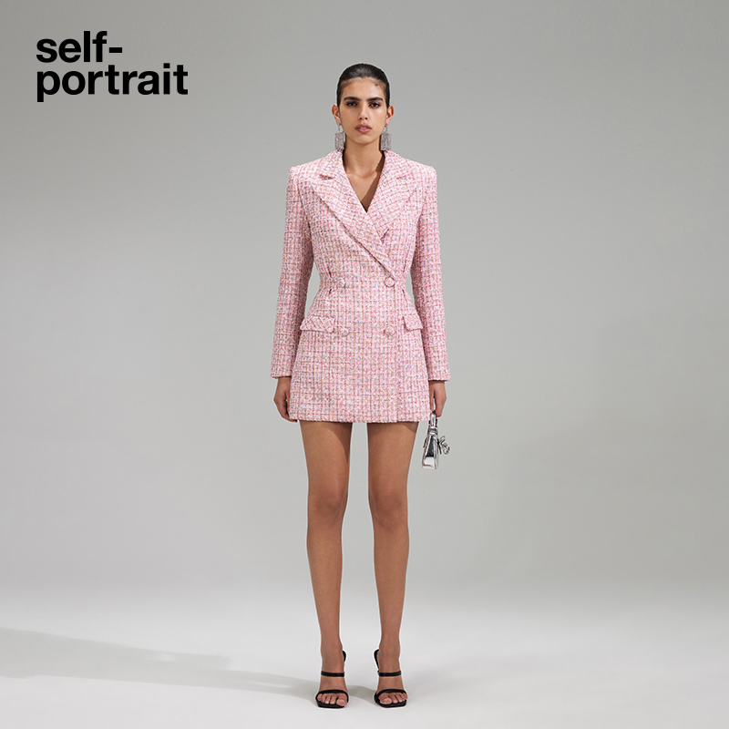 self-portrait 2023 early spring pink woolen V-neck commuter slim dress skirt