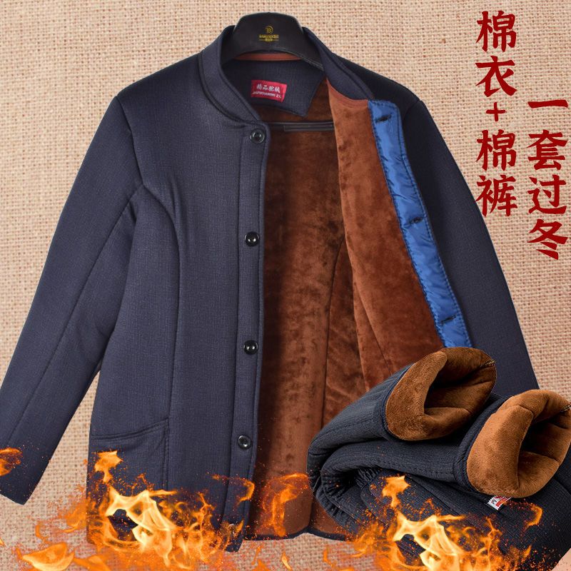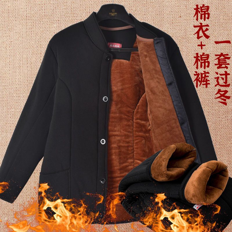 Middle-aged and elderly men's cotton-padded jacket and trousers thickened with fleece and warm clothing suit dad winter clothes elderly cotton-padded suit grandpa - Taobao