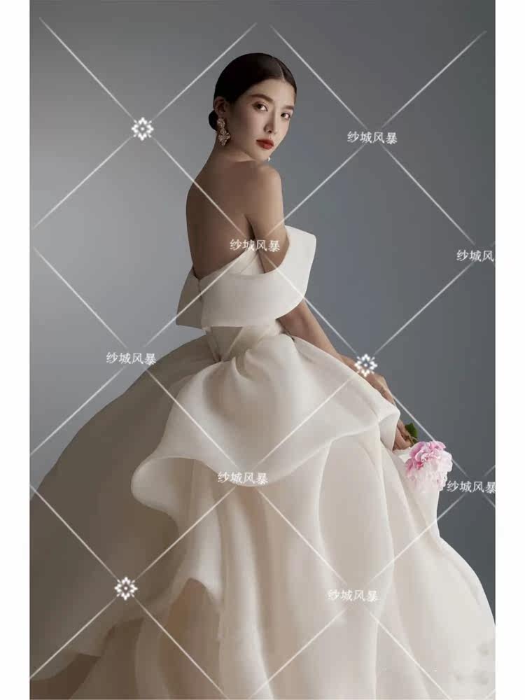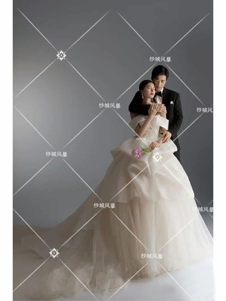 Studio indoor Korean theme clothing minimalist light wedding photography couple photo shoot main yarn one-shoulder dress