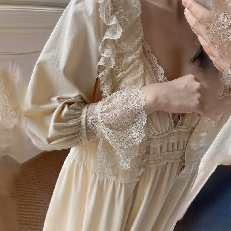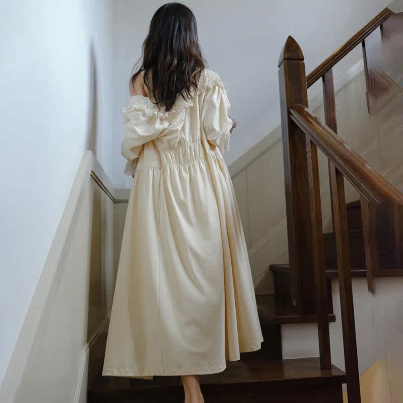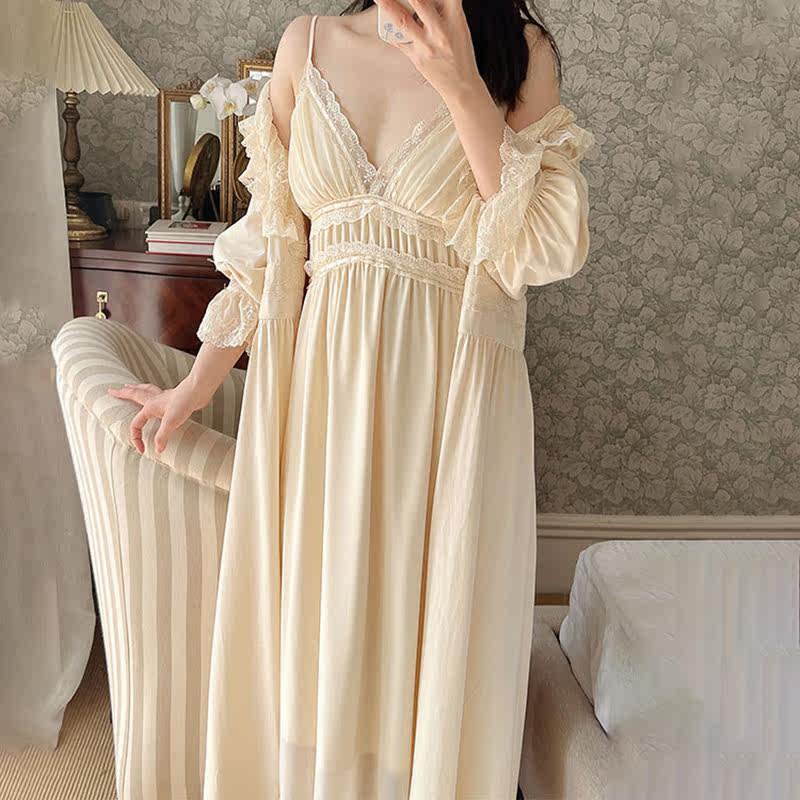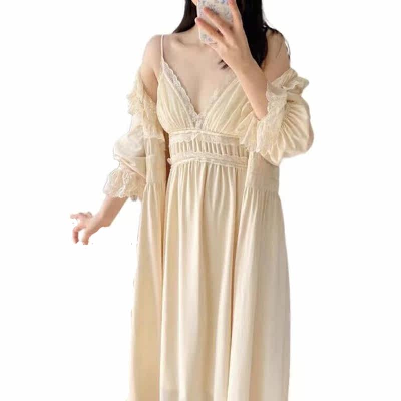 Huajian New Product Two-piece Set Autumn and Winter Advanced Mesh French Bridal Morning Gown Heavy Industry Sling Sexy Court Nightdress