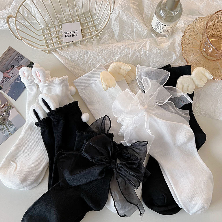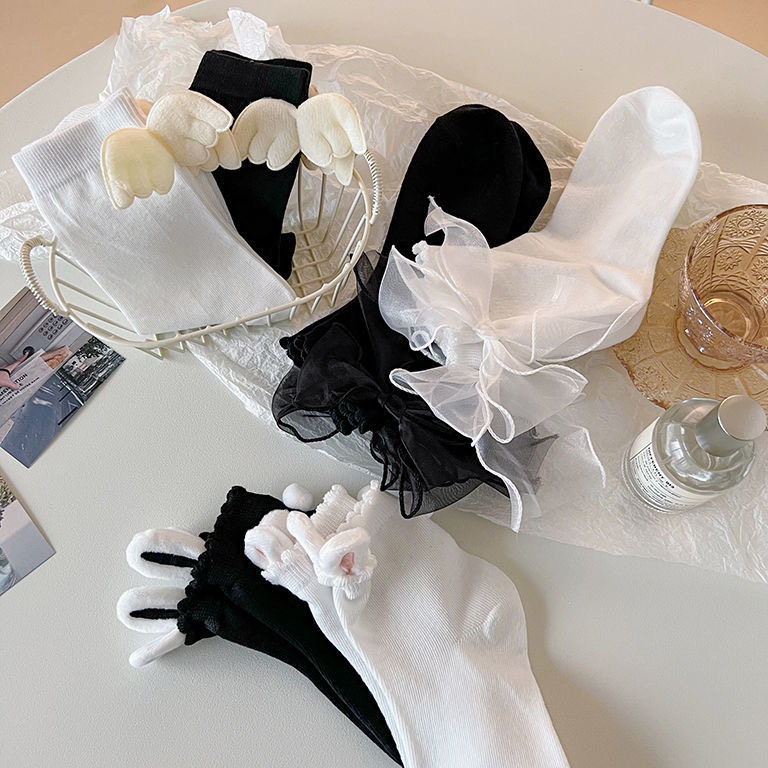 White rabbit ears, white wings, white bow, black bow, black rabbit ears, black bow, white wings, black wings, white bow, white wings, white bow, black bow, white rabbit ears, black rabbit ears, white butterfly