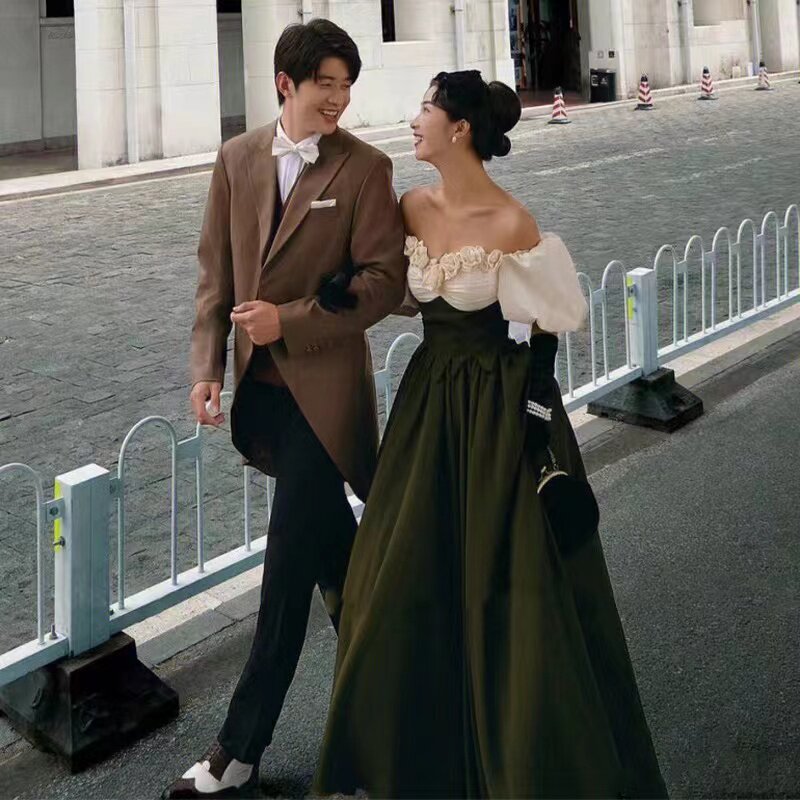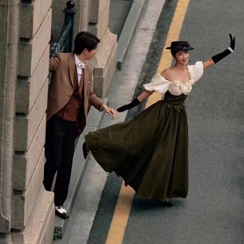 Studio theme clothing photography retro street photography French wedding couple photo shoot dark green one-shoulder dress