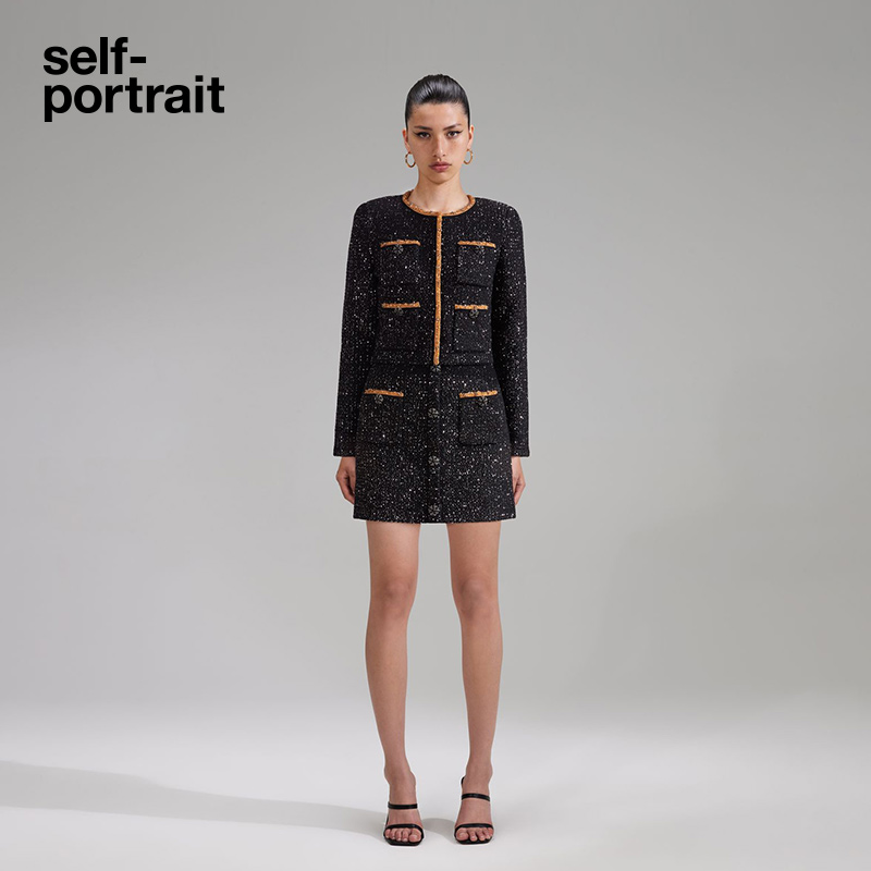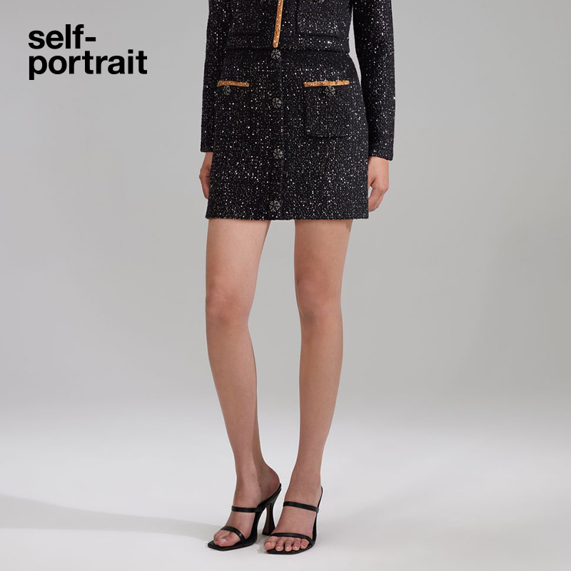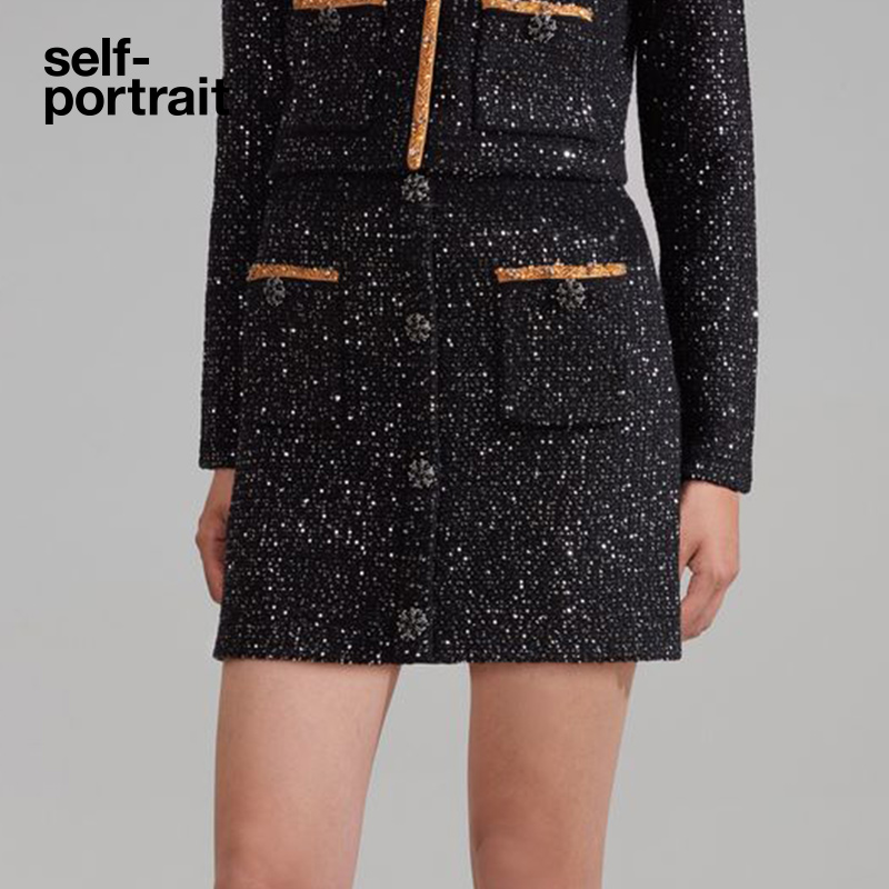 self-portrait 2023 early spring black mixed color sequined knitted beaded diamond gold-trimmed wrap skirt