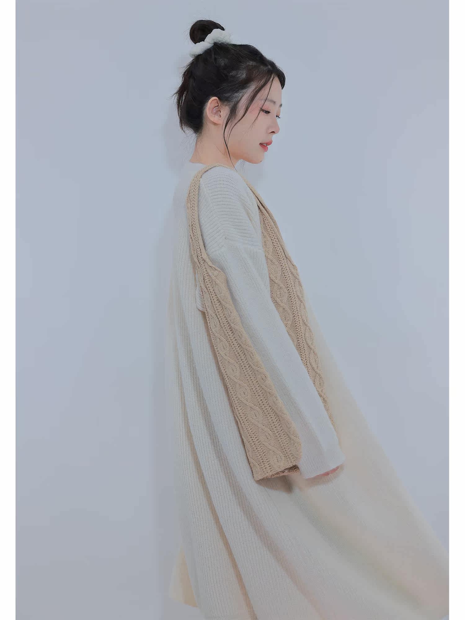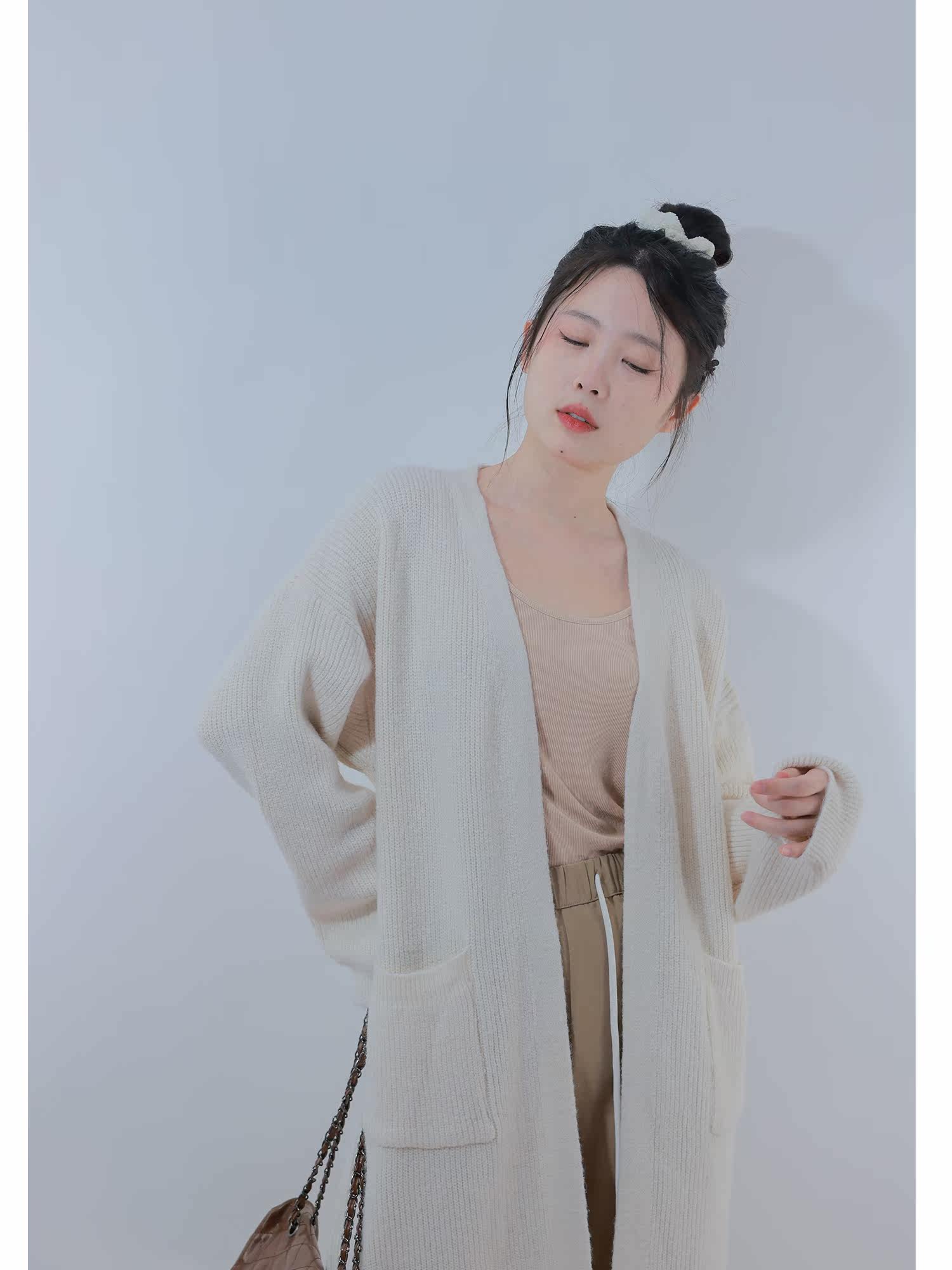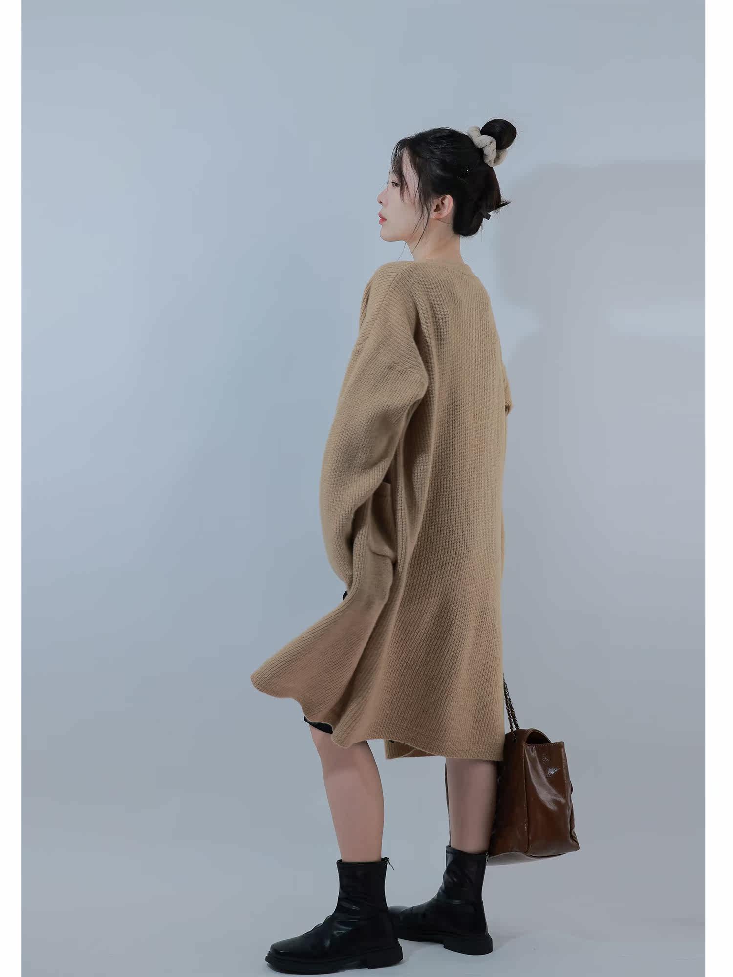 Sister Hu's solid color mid-length sweater coat women's autumn and winter new lazy style retro outer wear over the knee knitted cardigan