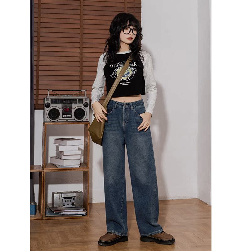 High waist thin velvet straight jeans women's autumn and winter retro distressed asymmetric color contrast loose fleece wide-leg casual pants