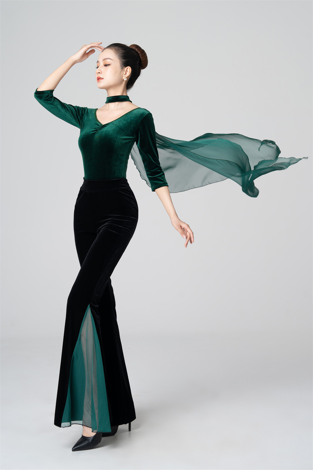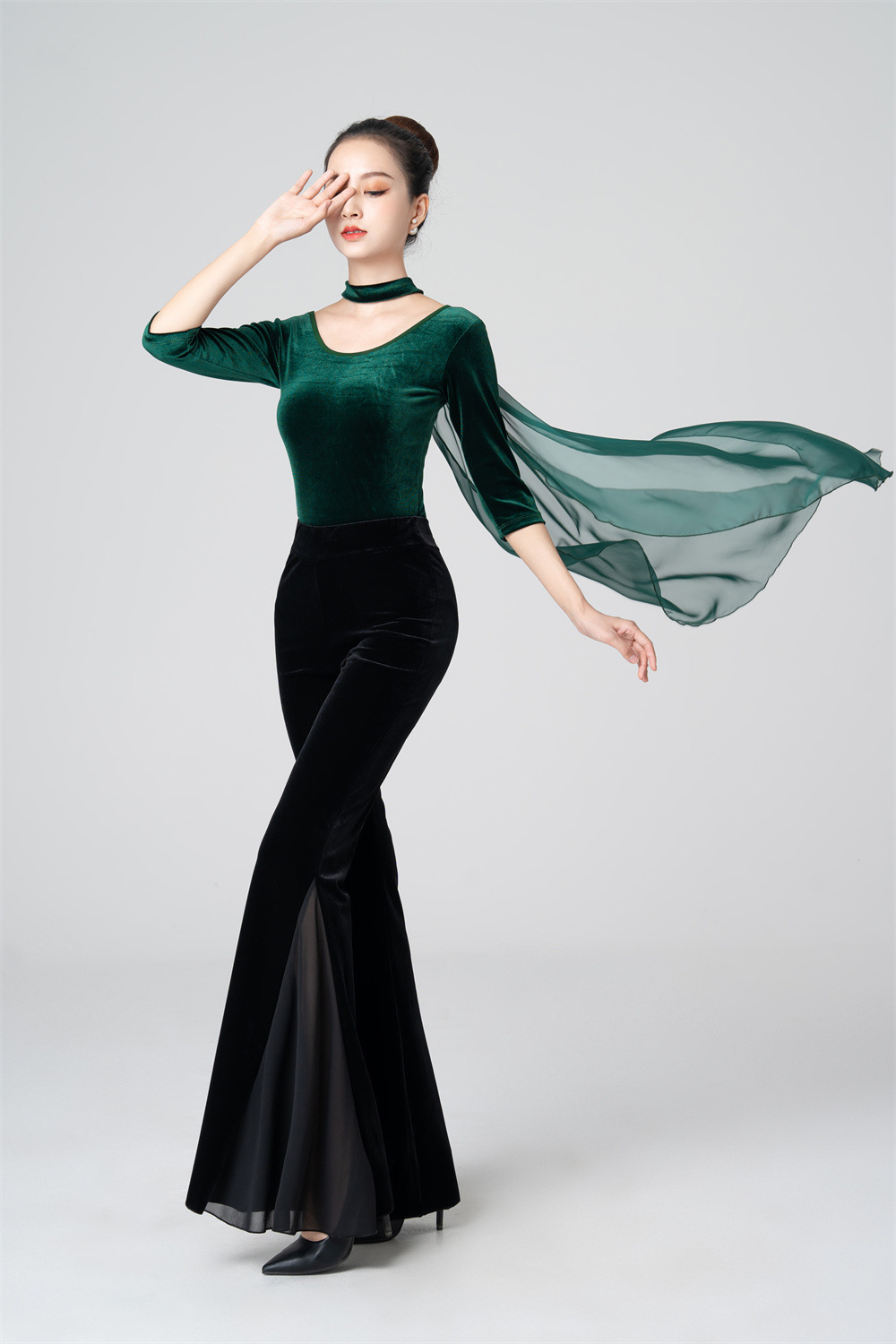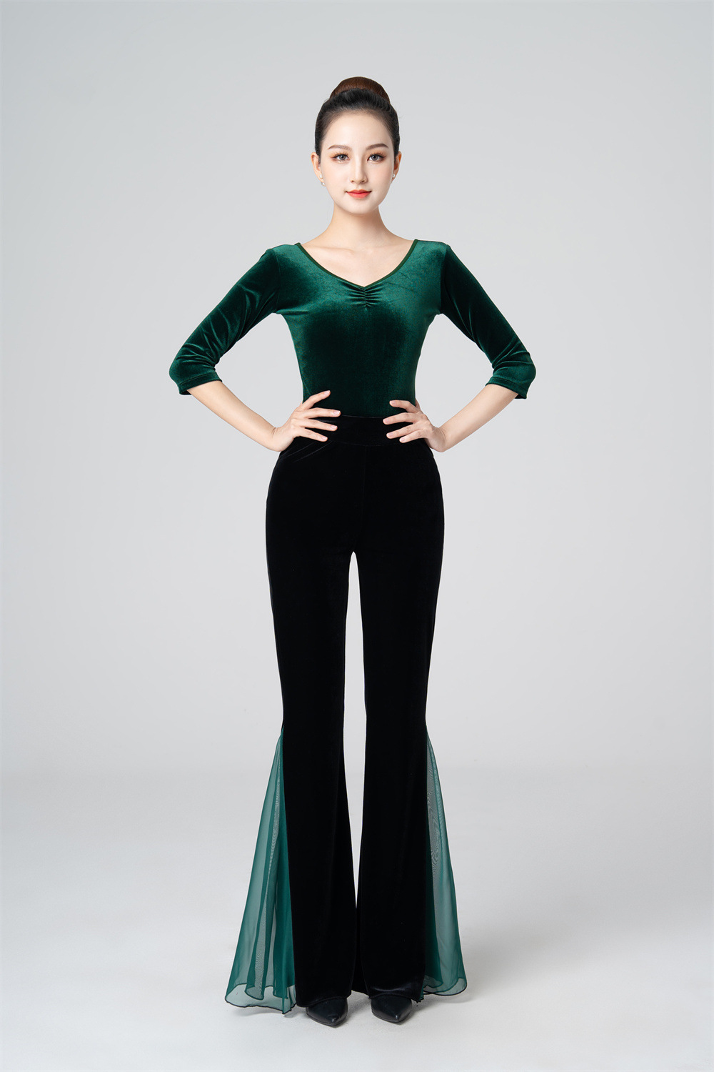 V-neck green one-piece buttoned sleeves and green flared trousers Neck V-neck green one-piece buttoned sleeves Black flared trousers Neck V-neck green one-piece buttoned sleeves Black small flared trousers Neck round neck