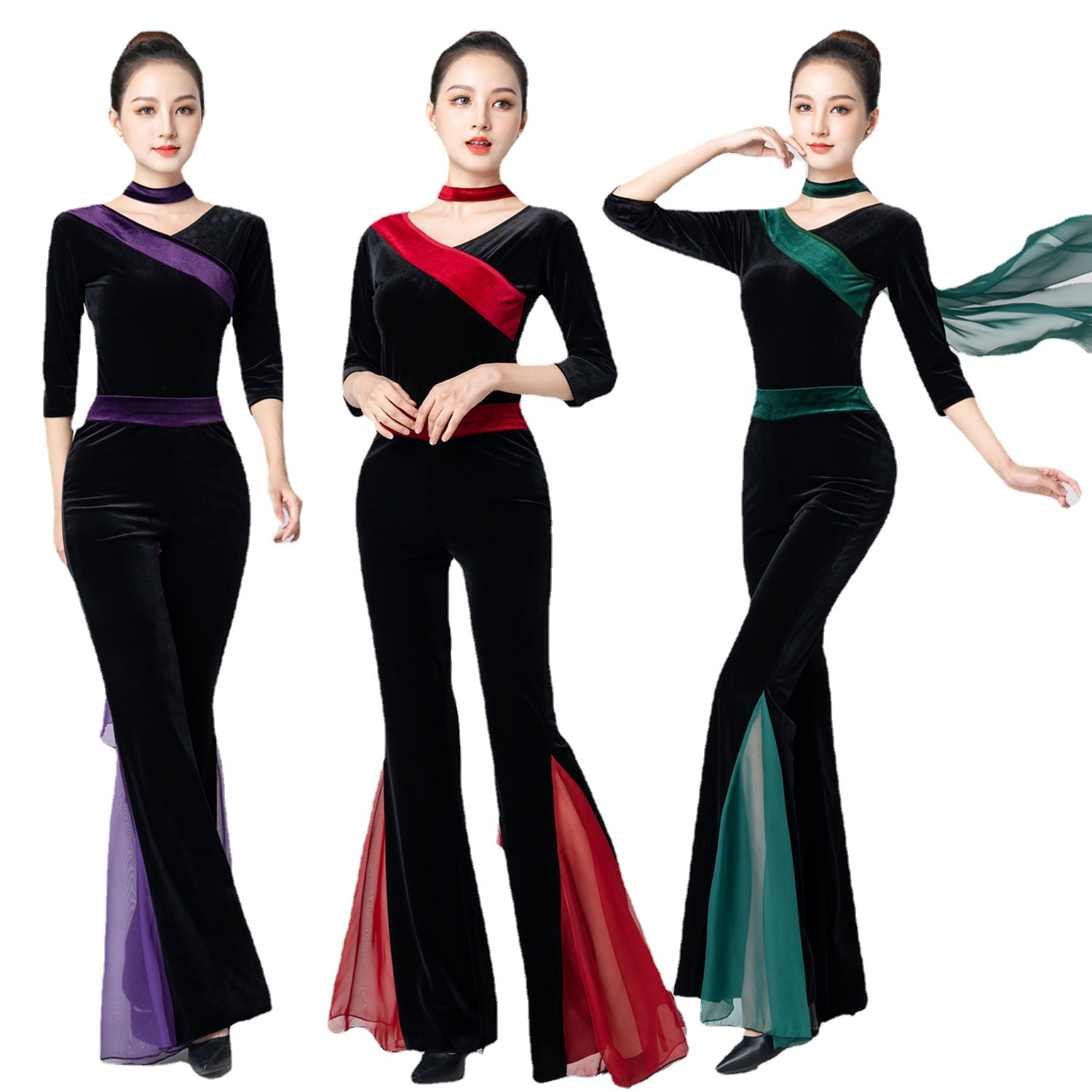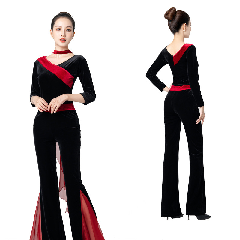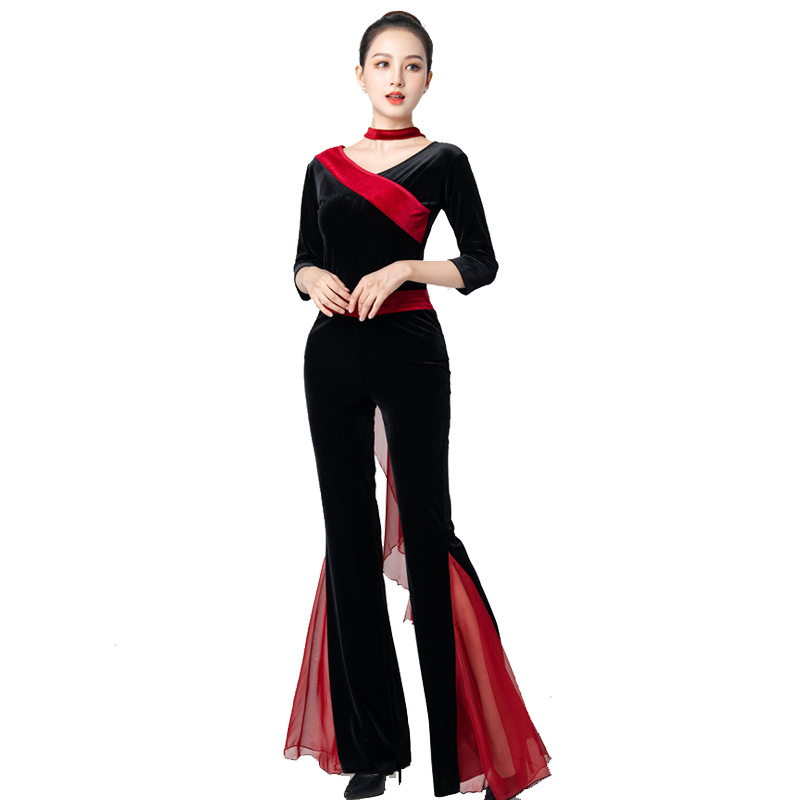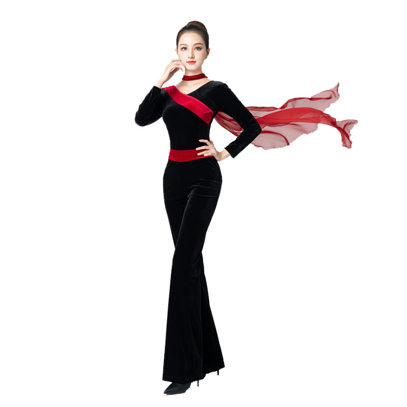 Golden velvet red one-piece buttoned sleeves red flared trousers Neck gold velvet red one-piece buttoned sleeves black flared pants Neck gold velvet red one-piece buttoned sleeves black small flared pants neck