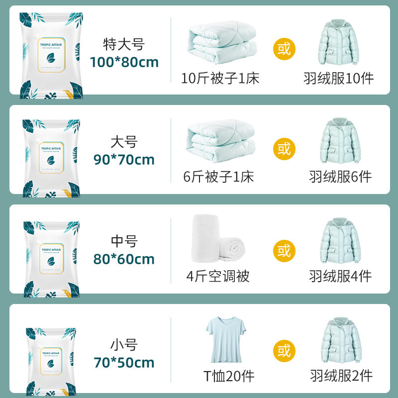 Small number 70 * 50cm (clothes clothing contained) No. 80 * 60cm (thin quilted with cotton clothing) Large number 90 * 70cm (5-8 kilograms of quilt contained) Extra large 10
