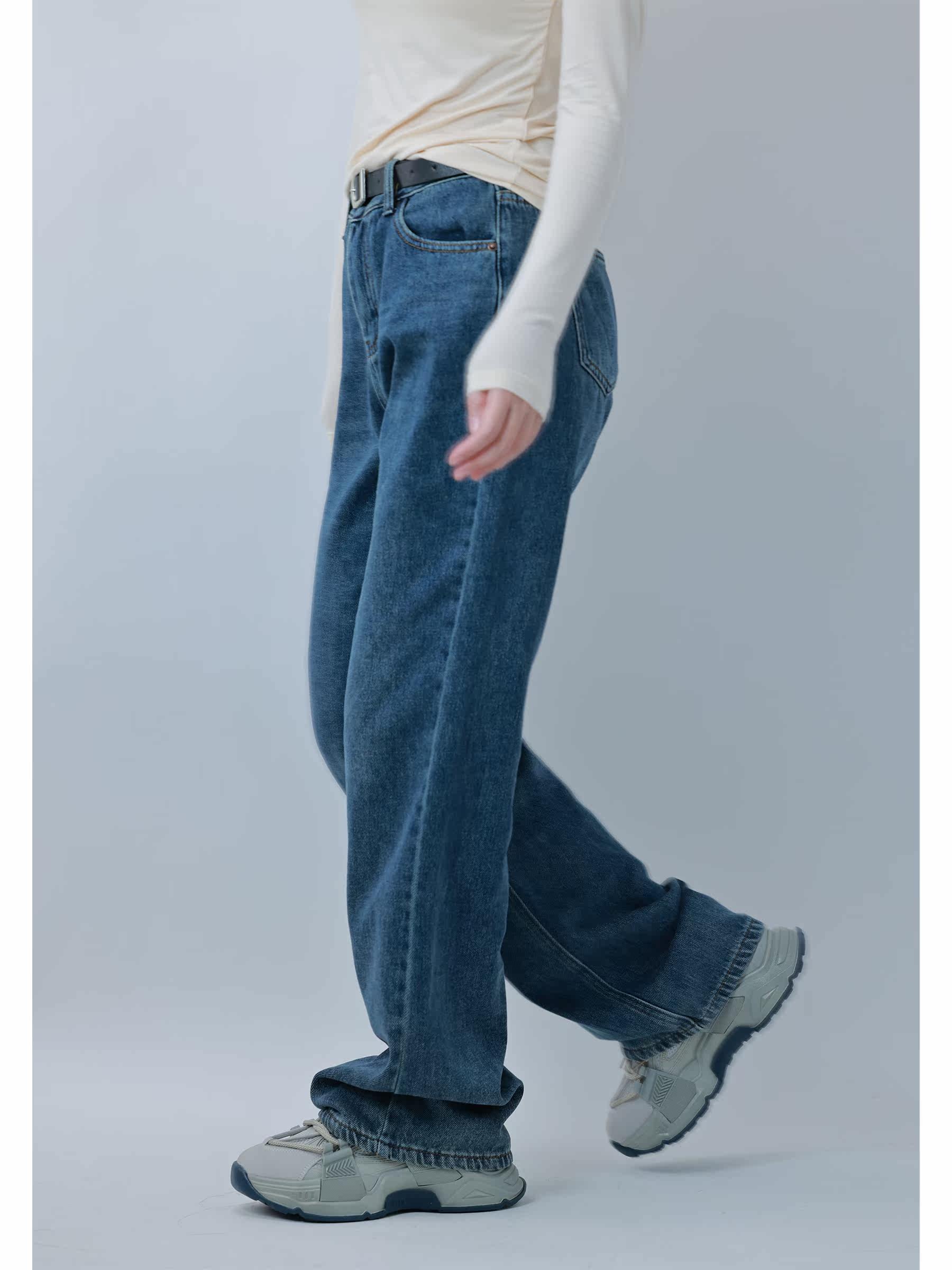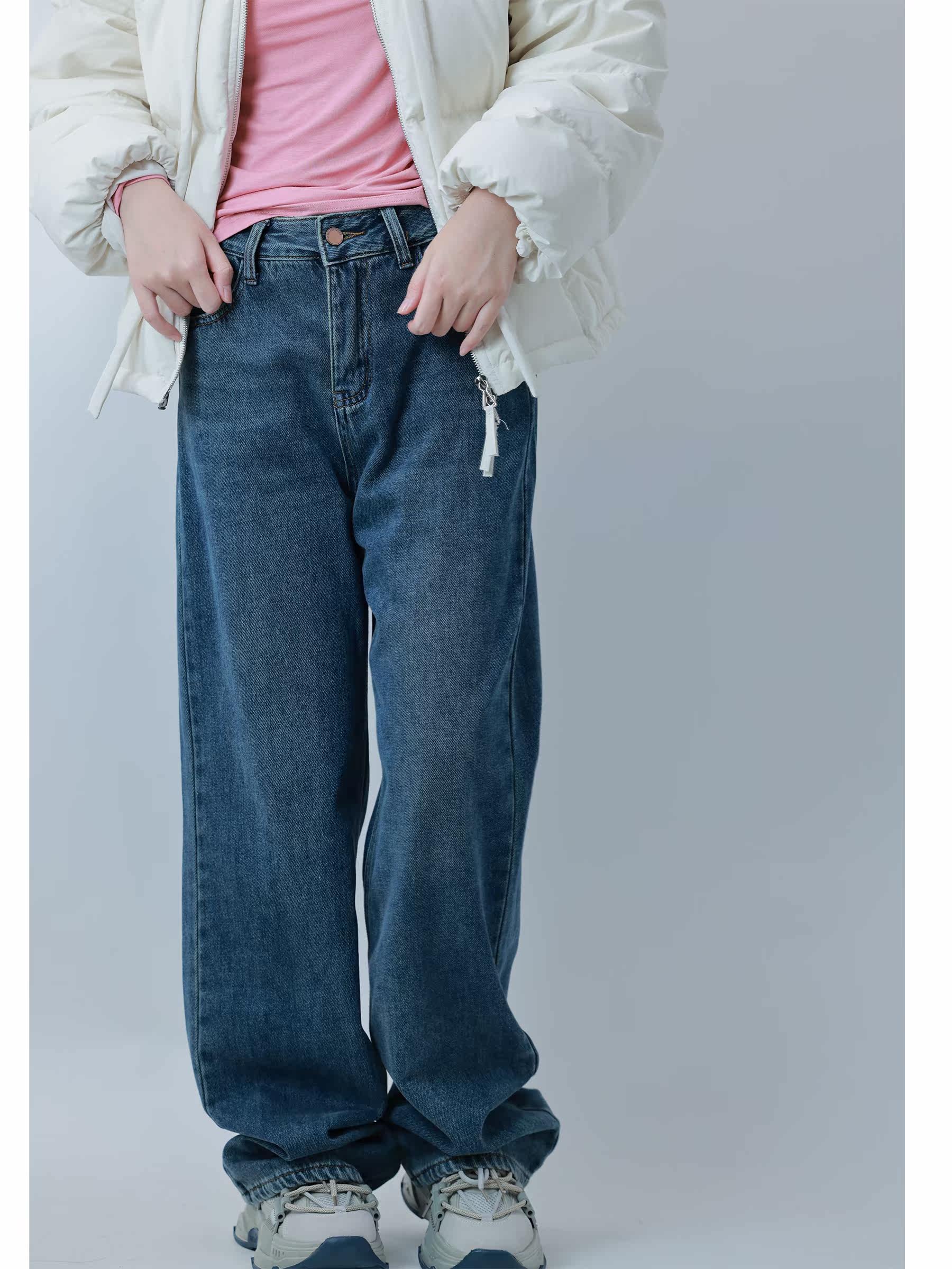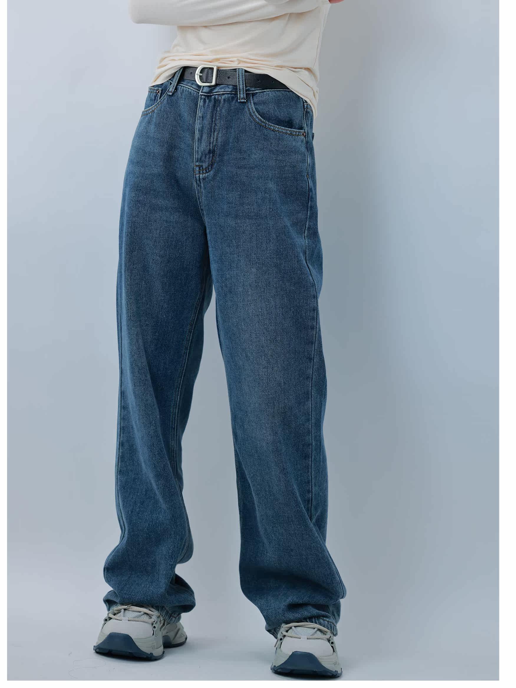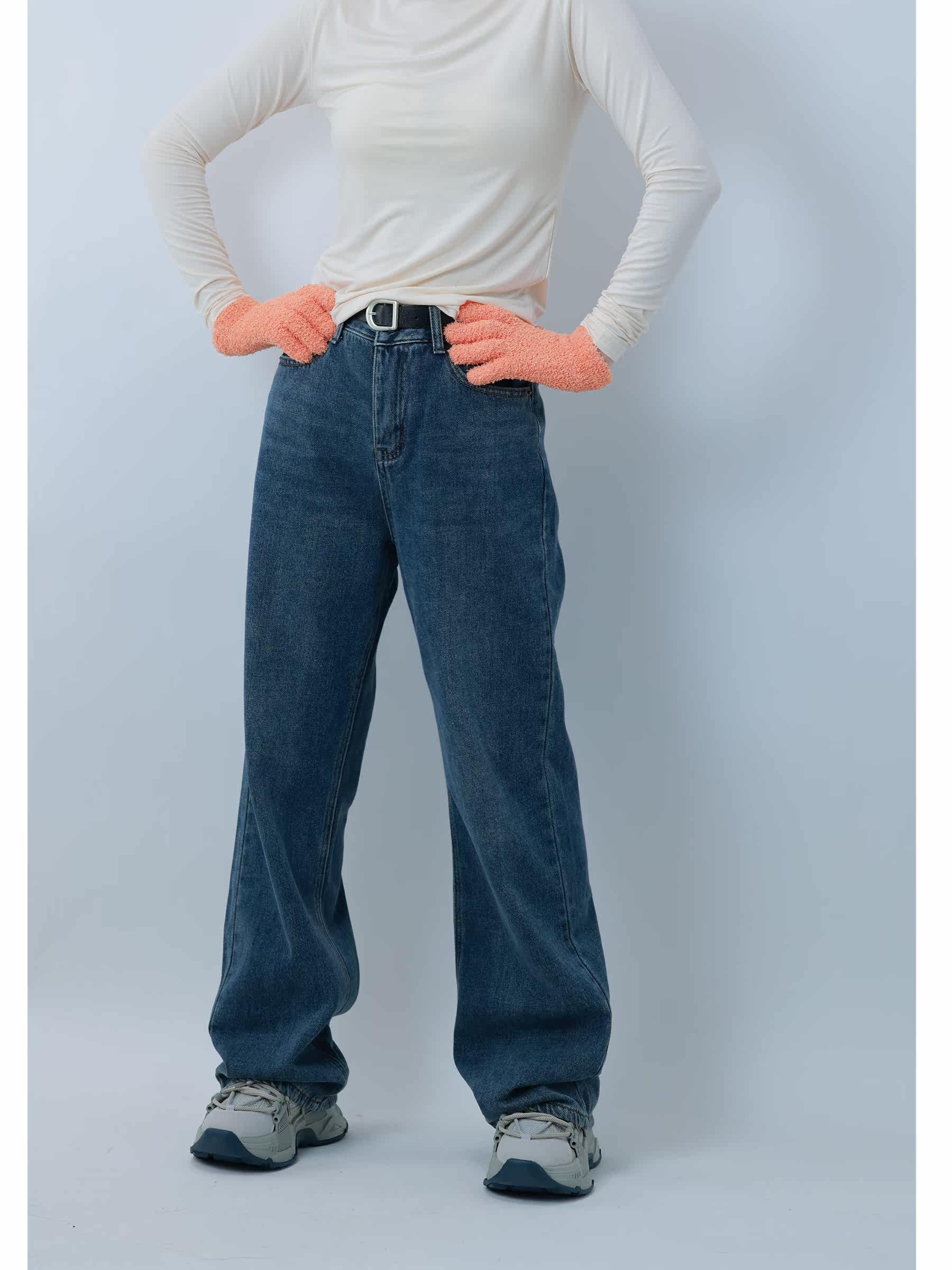 Hu sister fleece jeans women's 2022 autumn and winter new Korean version loose high waist slim straight trousers with belt