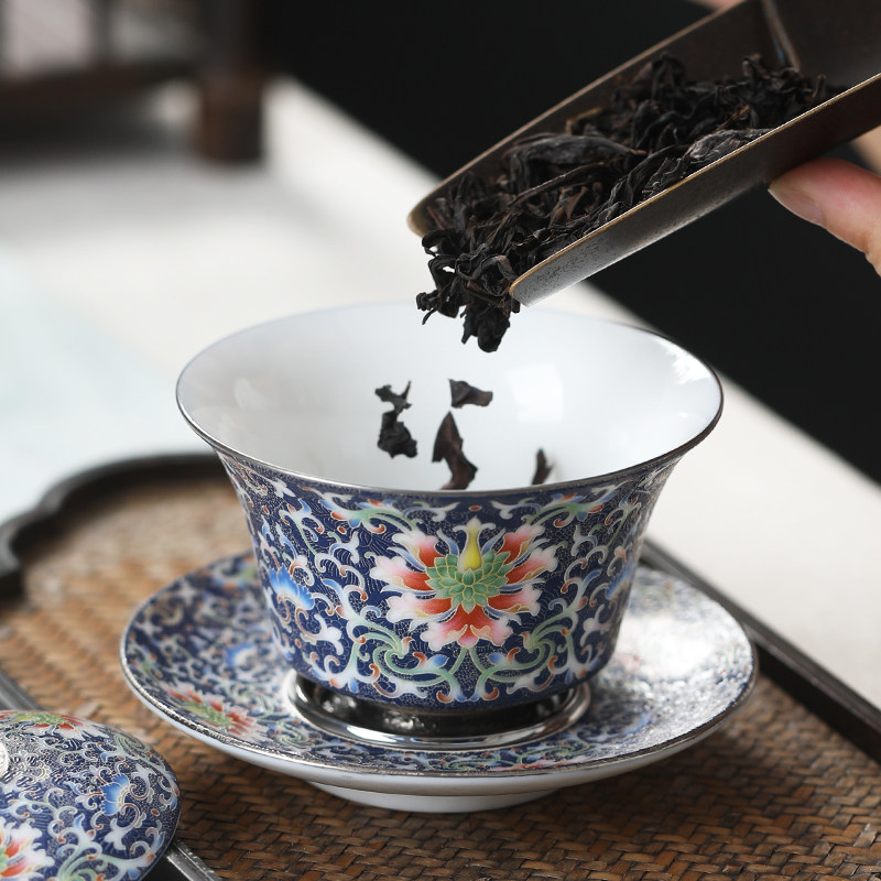 Su's ceramic Kung Fu tea set Three talents cover bowl Pinch Silver Brocade Embroidered life Blue Huang Xudong Master Gold Award Works-Taobao