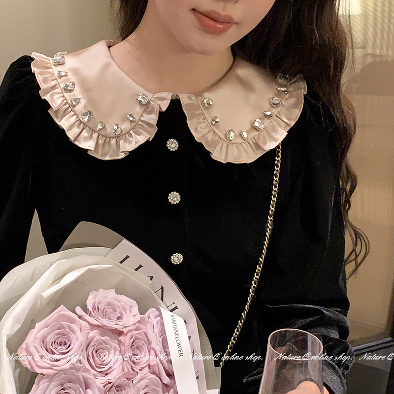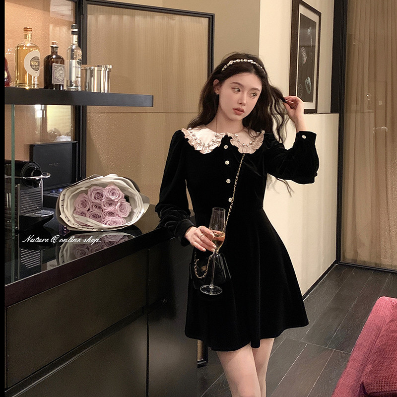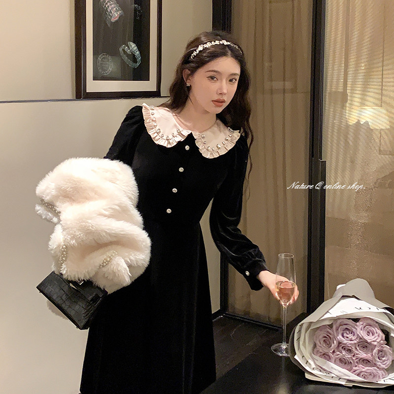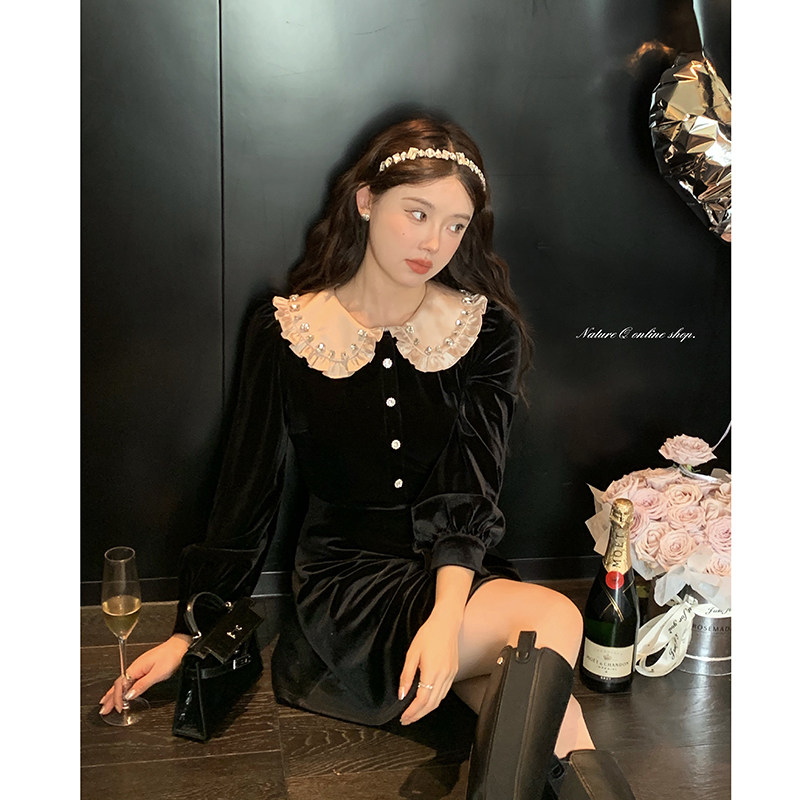 Yang Little Volume Miu family rich family small thousands of gold silk suede one-piece dress lady autumn and winter French style retro Hepburn small black dress-Taobao