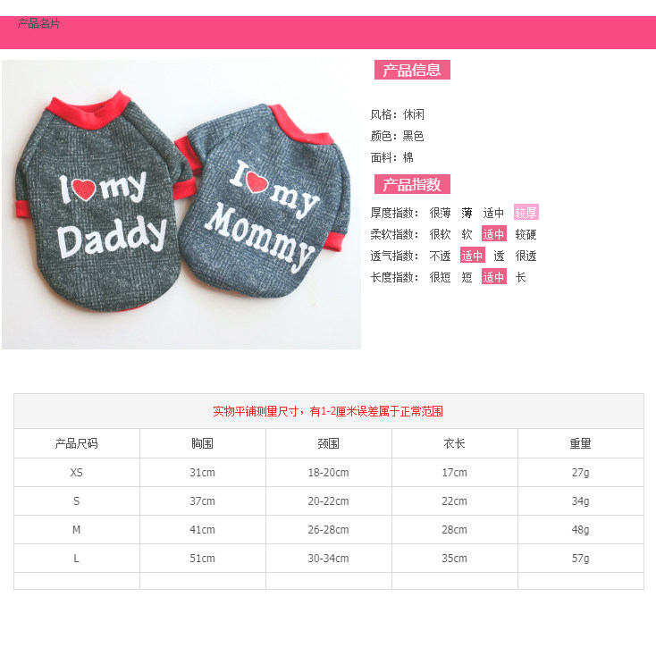 XS (chest circumference 31CM back length 17CM) (suitable for about 2-3 catty) M (chest circumference 41CM back length 28CM) (suitable for about 6-9 catties)