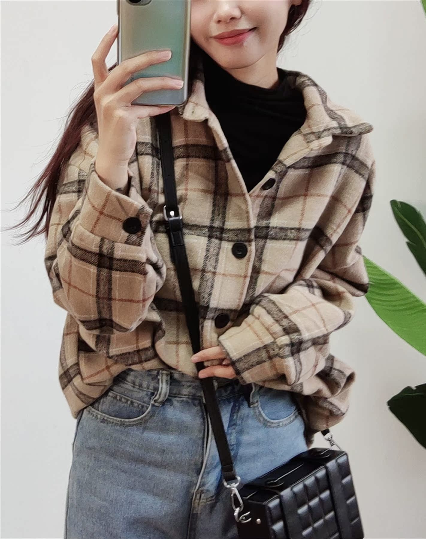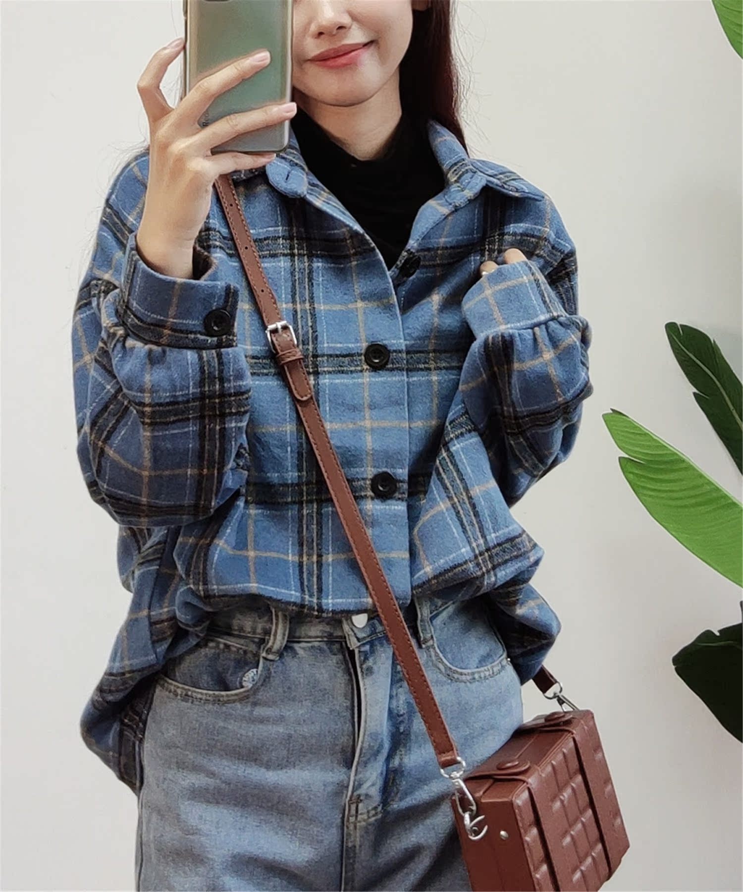 Spring and autumn loose retro woolen plaid coat brushed shirt women's design sense niche top long-sleeved Japanese trade