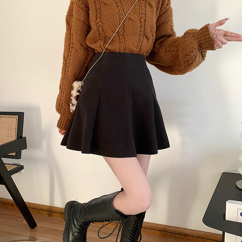 Wool skirt spring, autumn and winter look thin A-line big swing umbrella skirt high waist small black skirt femininity French Japanese style