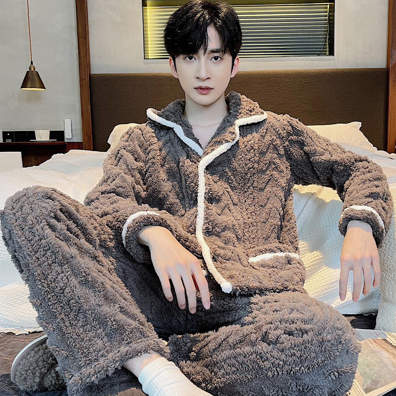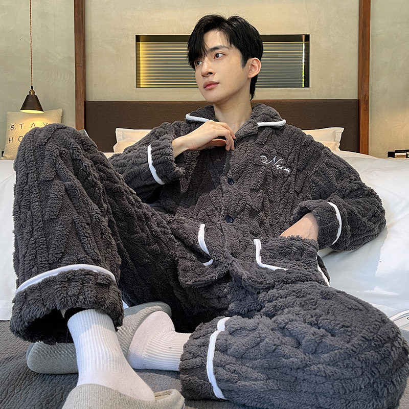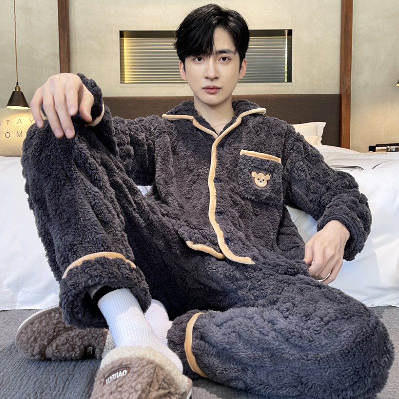 Coral suede sleepwear men's winter plus suede thickened 2023 new autumn and winter days men's flannel suede suit-Taobao
