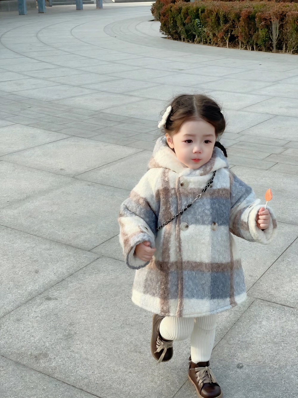 Beige lamb wool coat with a little coat of color.