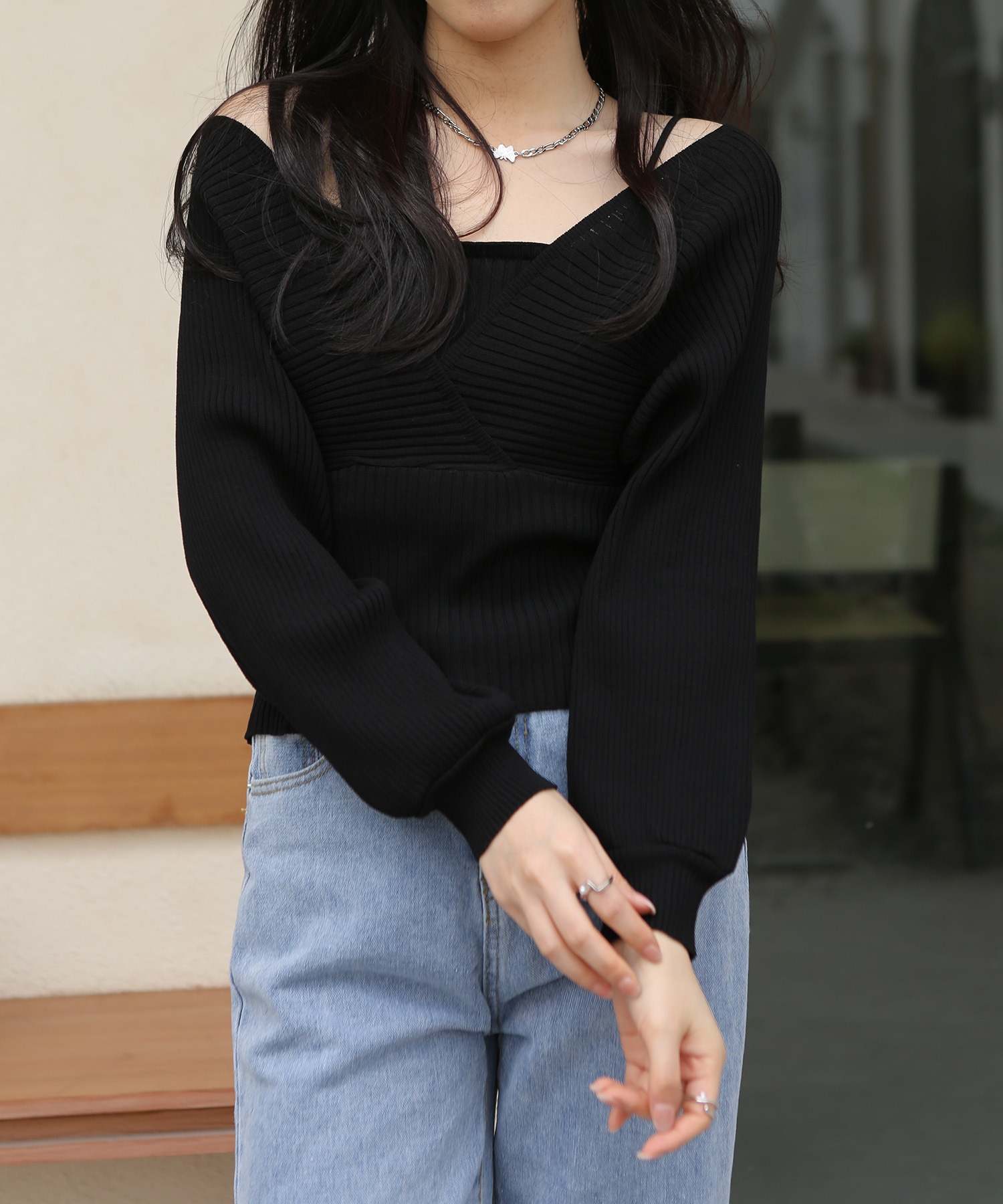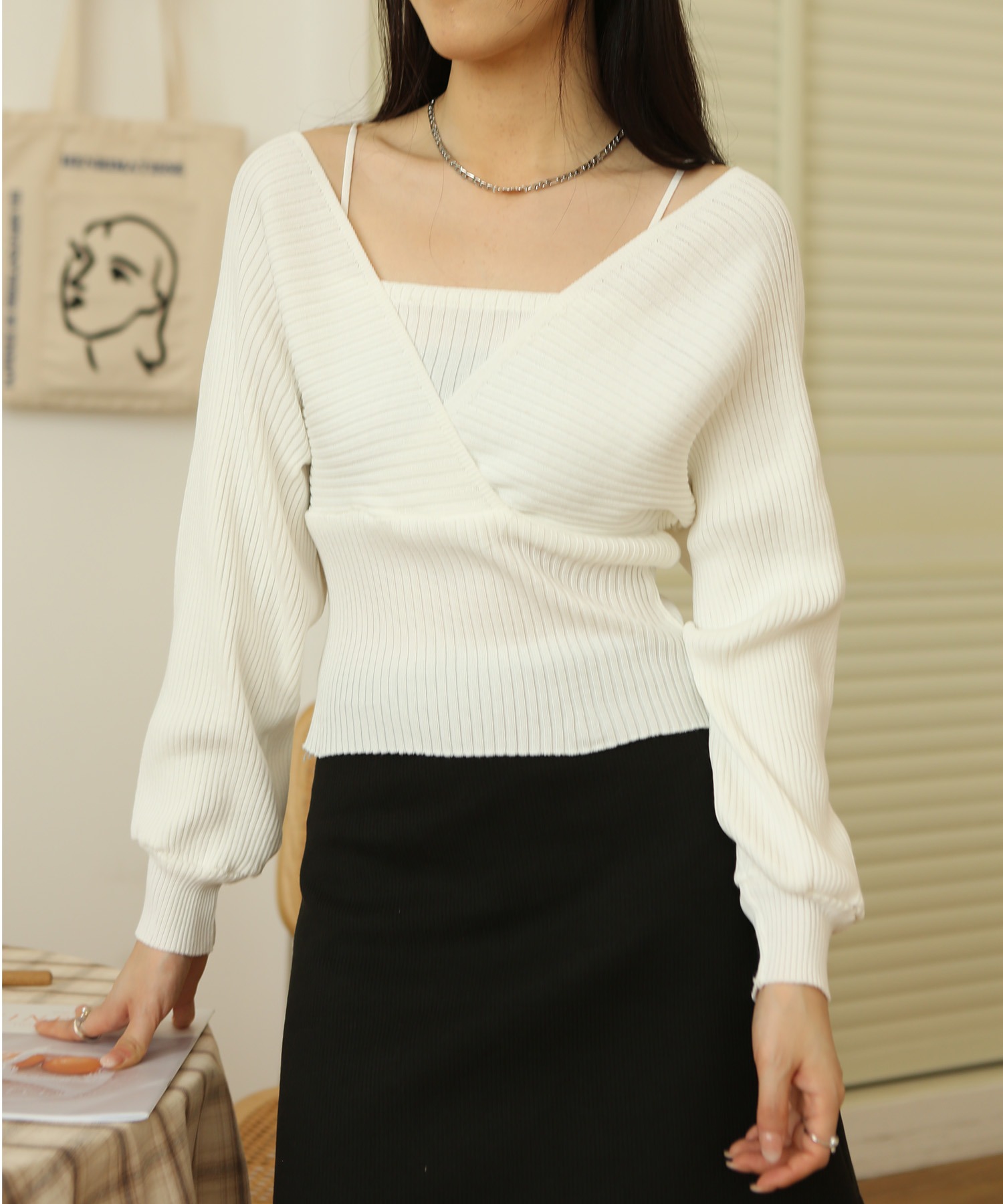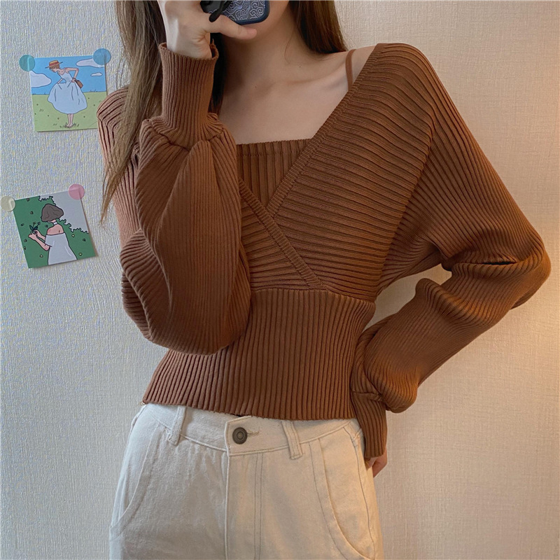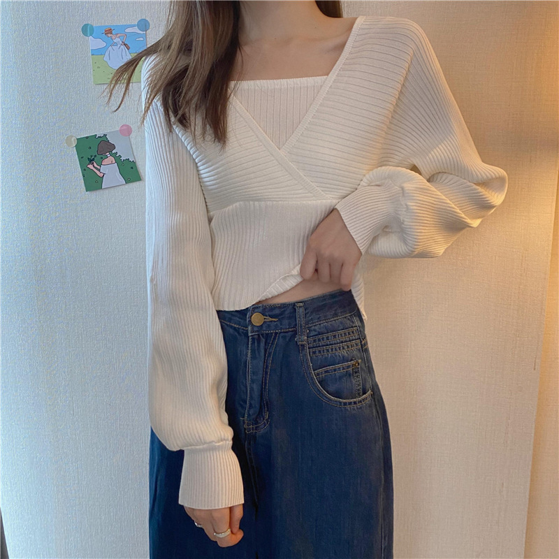 Square collar fake two-piece short knitted sweater women's Korean version with a sense of careful machine clavicle sweater versatile puff sleeve top
