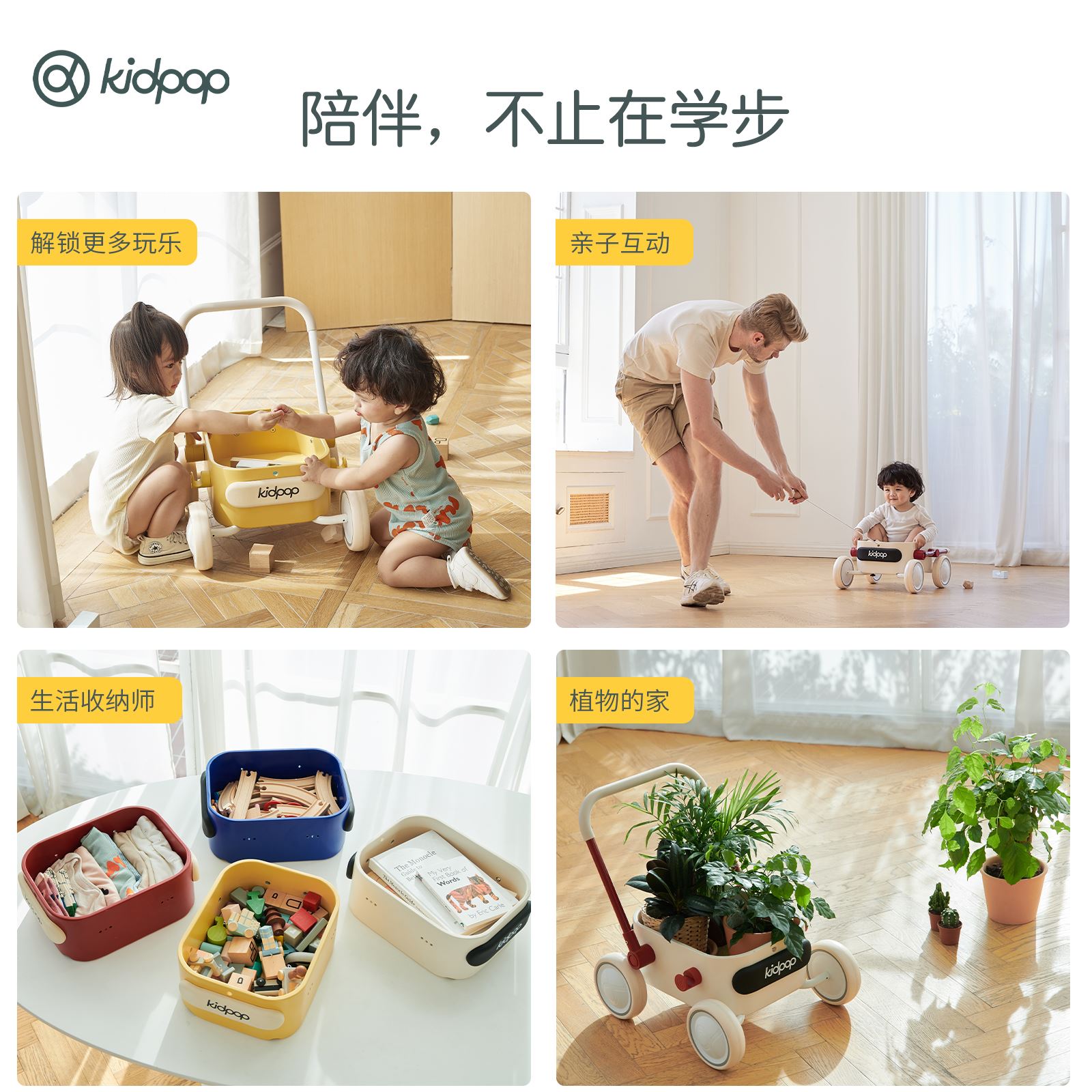 kidpop baby school walk-in multifunction solid wood small stroller coaster baby's birthday push toy car-Taobao