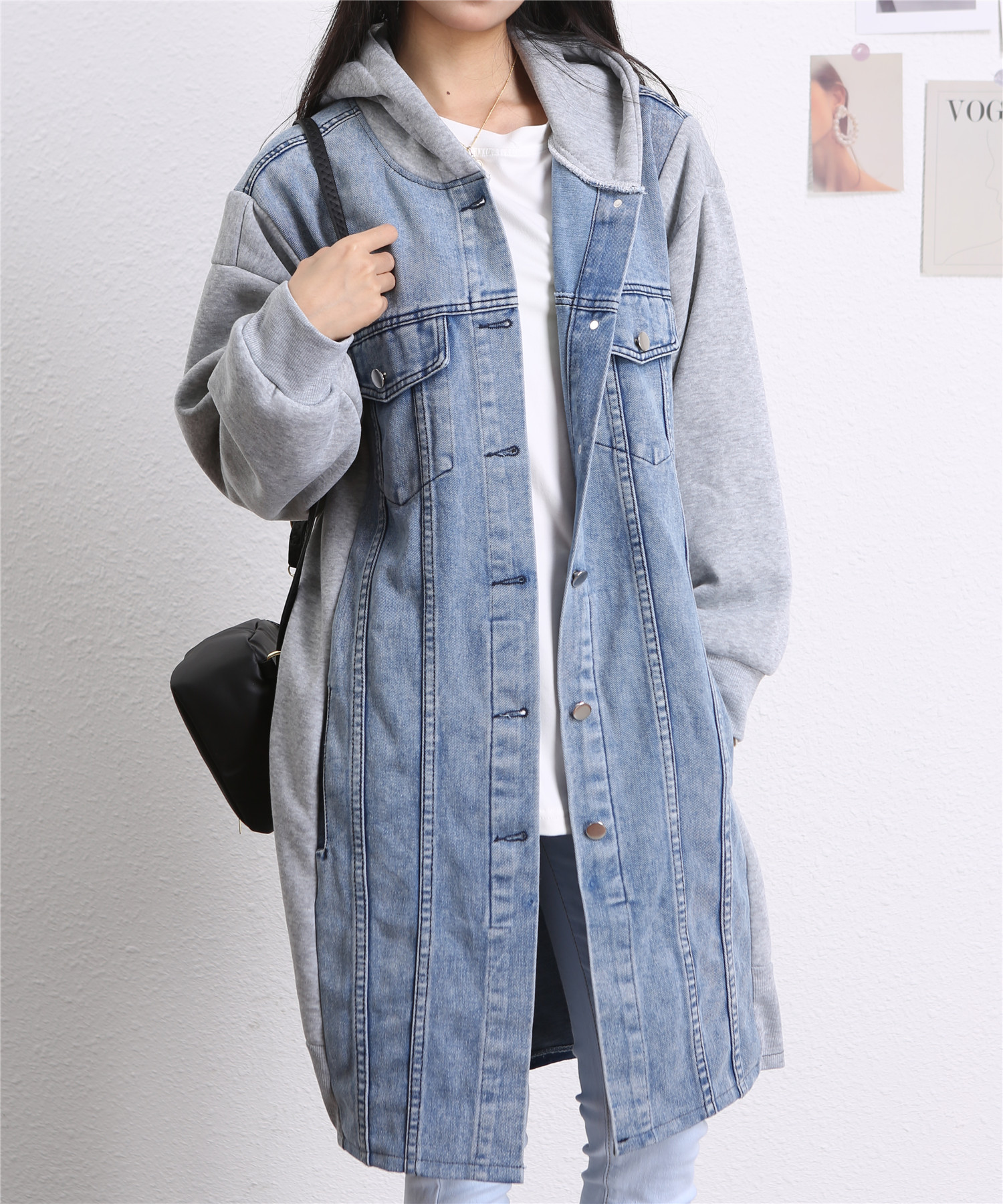 Fried street casual tooling hooded denim splicing sweater jacket women's loose mid-length all-match top student Japanese
