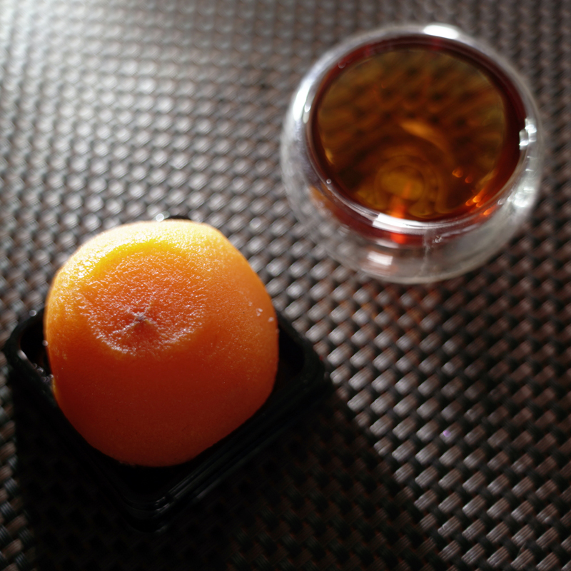 The persimmon cake in the green.