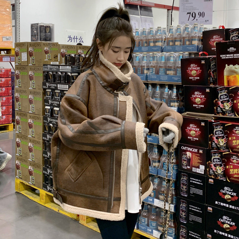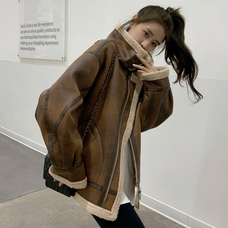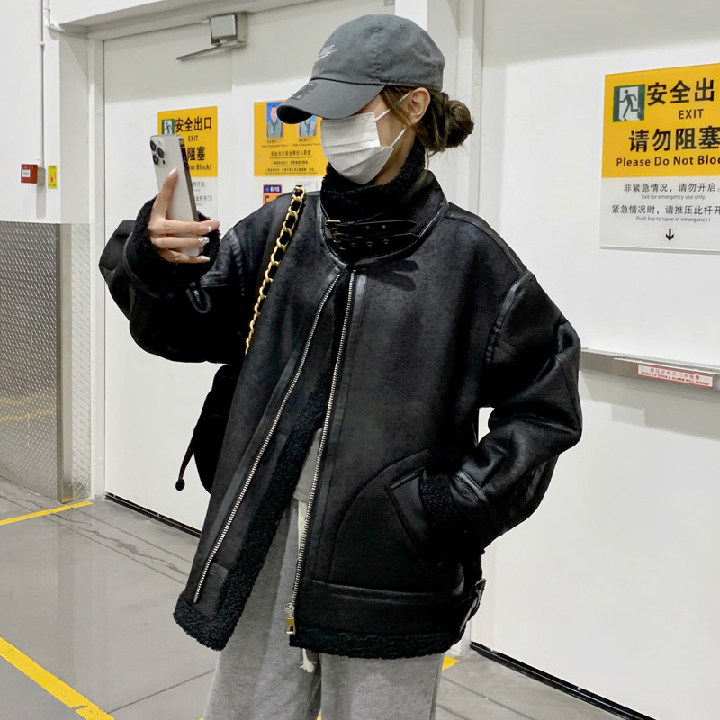 Lamb wool coat female winter 2023 new black plus suede thickened lamb suede fur integrated locomotive clothes cotton clothes-Taobao