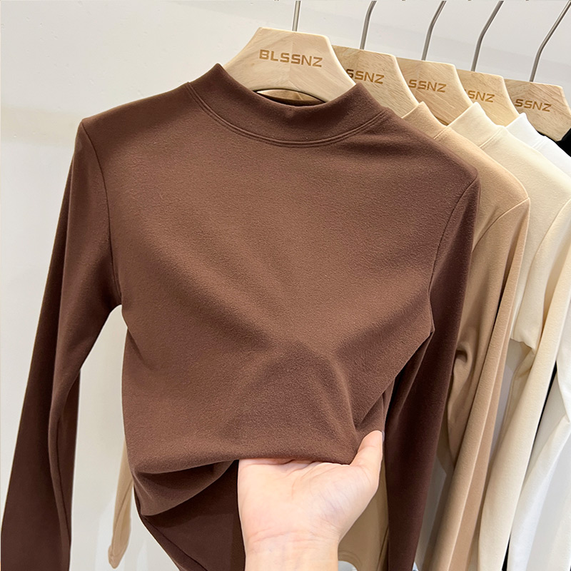 Double sided Develvet semi-high collar bottom-shirt female plus suede thickened warm medium collar blouse with long sleeve t-shirt woman-Taobao