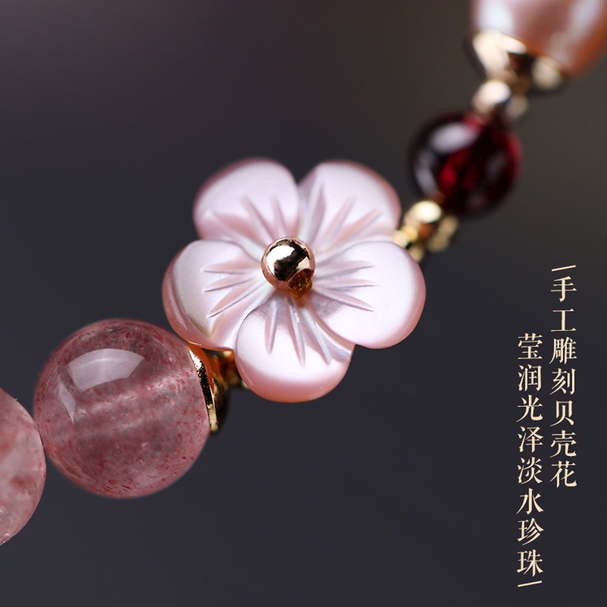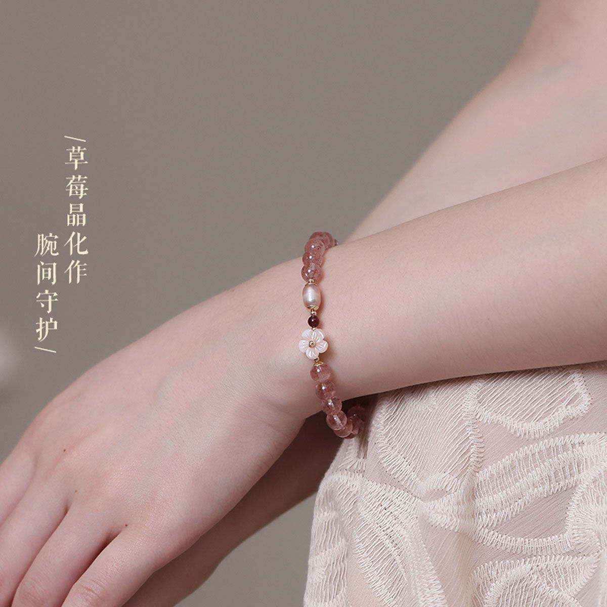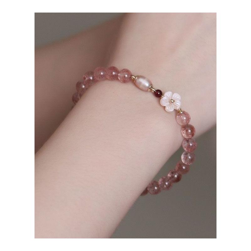 XS-Strawberry Crystal Peach Bracelet XS-Strawberry Crystal Peach Bracelet Two XS Strawberry Crystal Peach Bracelet Pink Pearl Bracelet XS Strawberry Crystal Peach Bracelet Clear Green Pearl Bell Hand