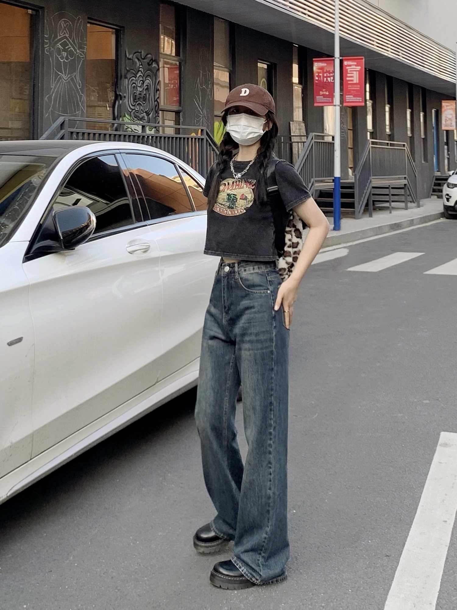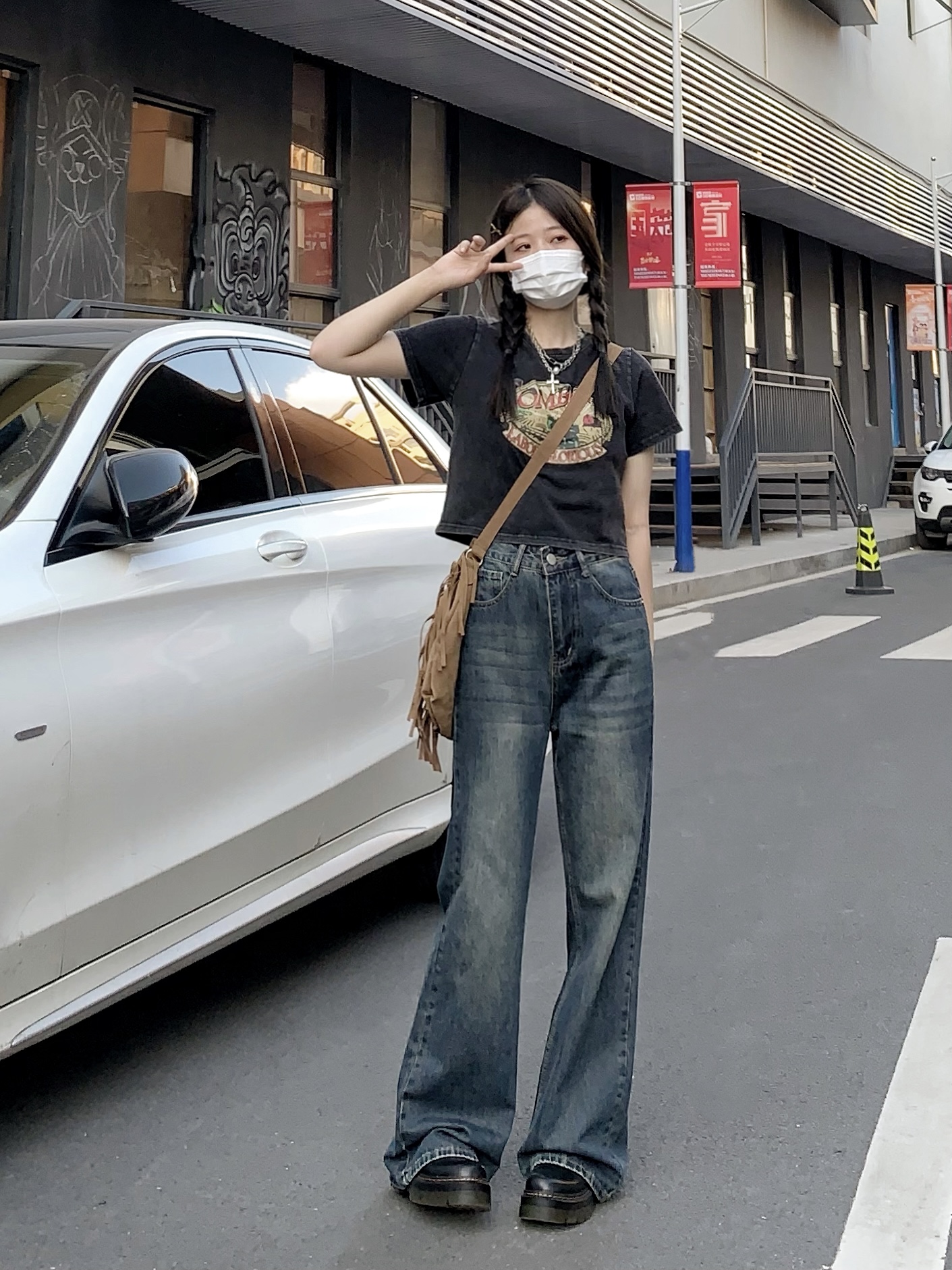 Chunge's high-waisted slightly booted jeans for women 2024 new style drapey wide-legged retro distressed loose floor-length pants