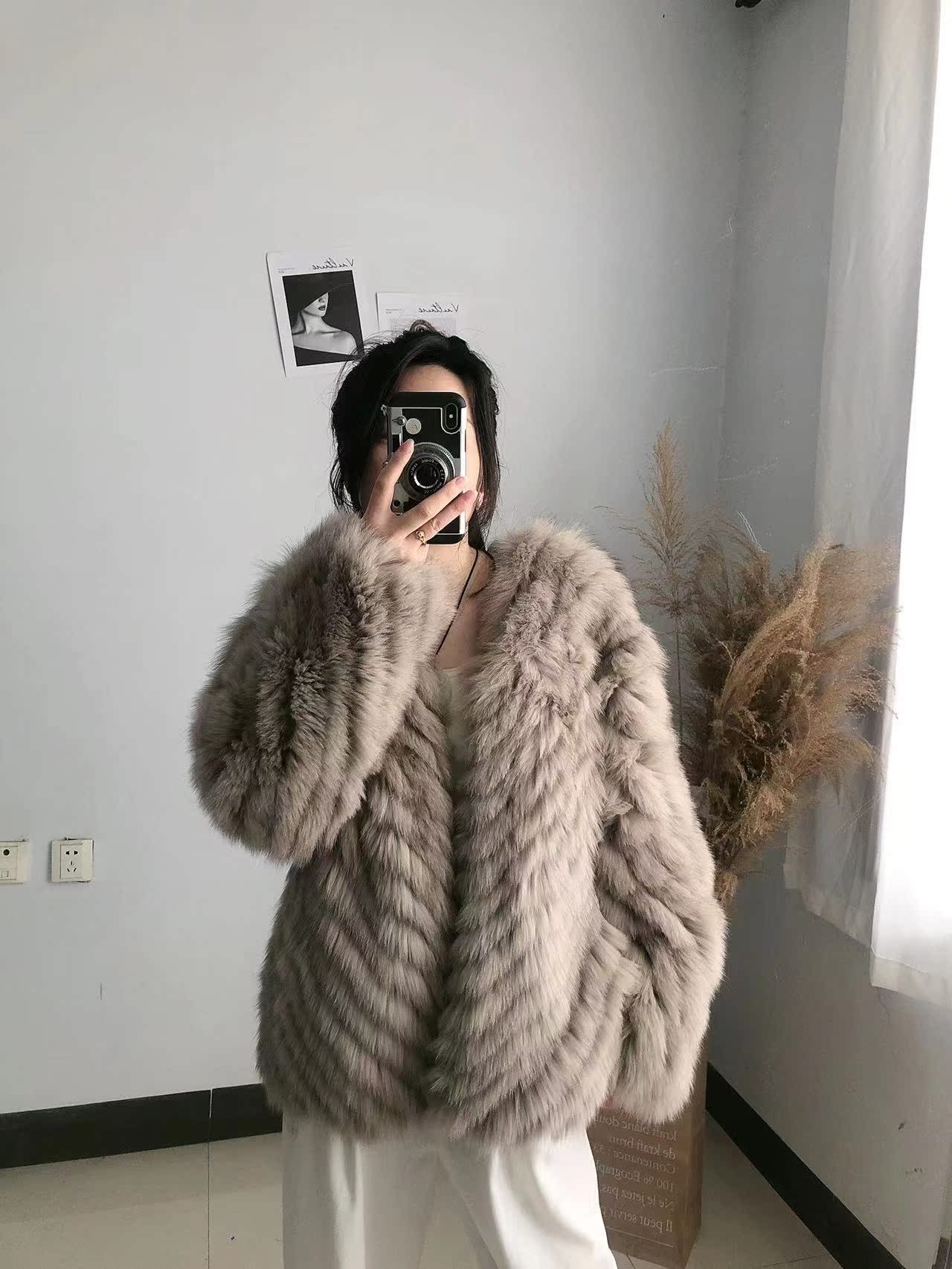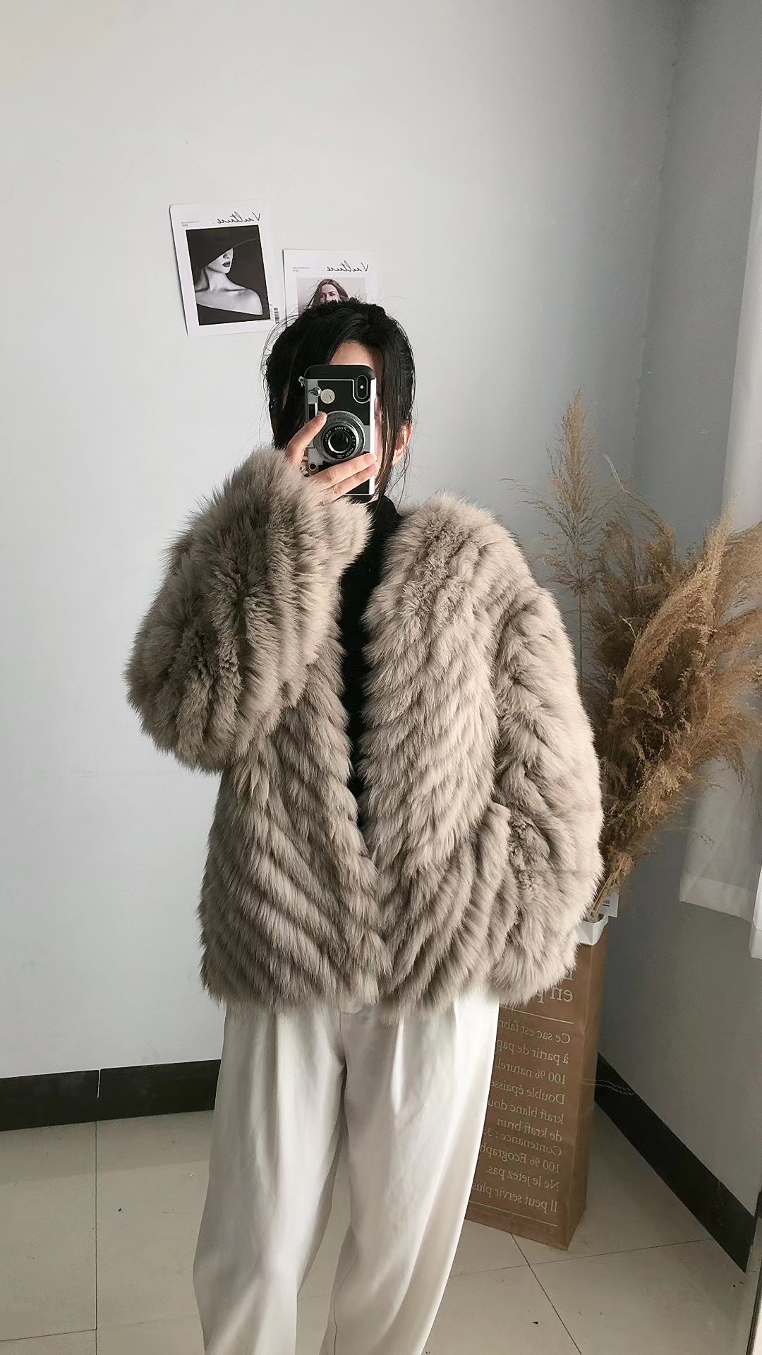 Imported fox fur long sleeve V collar whole leather cart Bar short jacket loose fox fur woven fur