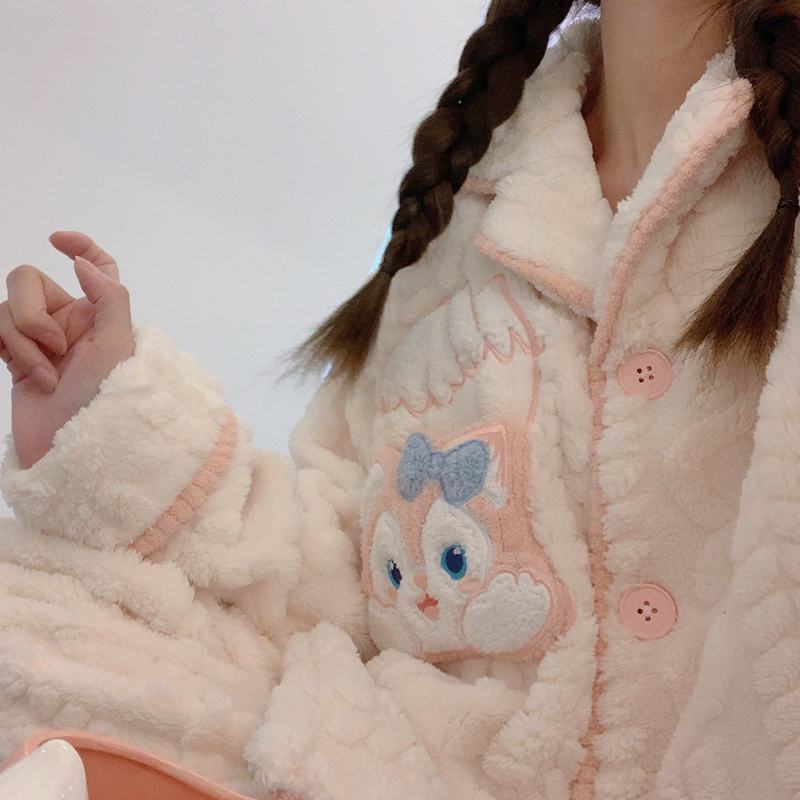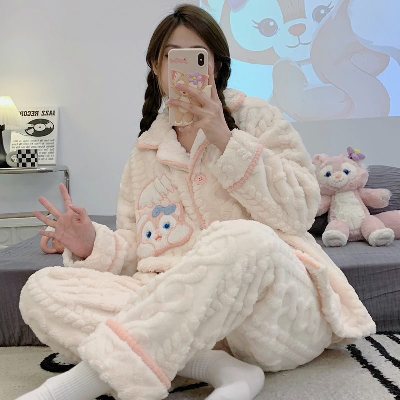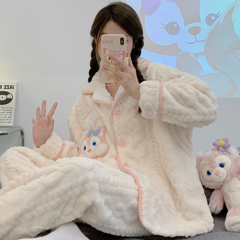 Lingnah Belle Sleepwear Woman Autumn Winter Coral Suede Plus Suede Thickened cute Net Red Wind Flannel Suede Suit-Taobao
