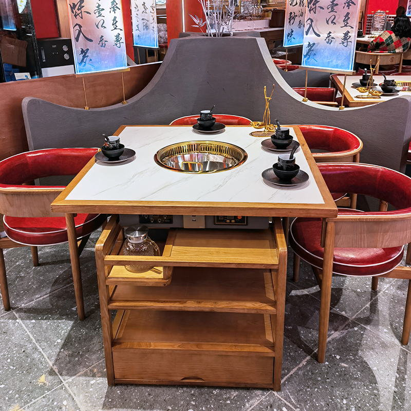 Smoke-free hot pot table commercial rock plate marble grilling integrated solid wood splicing ground down smoke venting self-roasting table-Taobao