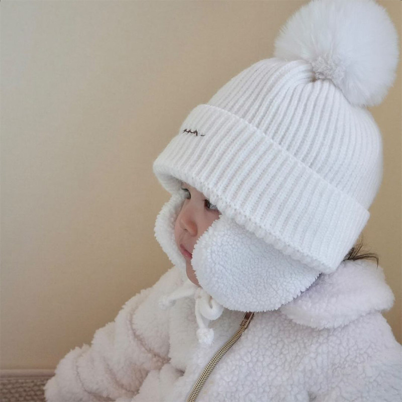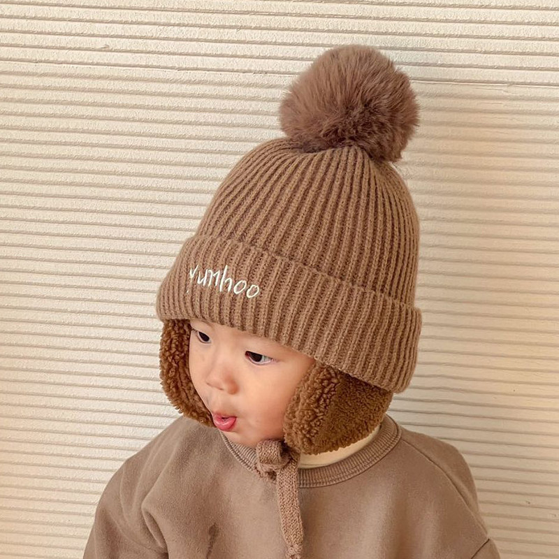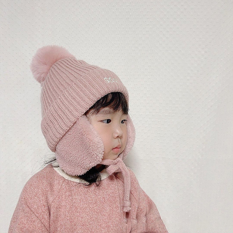 South Korea Hominin Child Care Ear Knit Warm Hat Cute hair Ball Embroidery Name Pure Color Warm Little Hat-Taobao