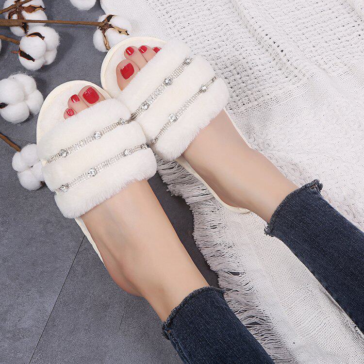 New fur shoes female Han version with cotton slippers Home Outside Wearing water drill flat-bottom plush slippers female