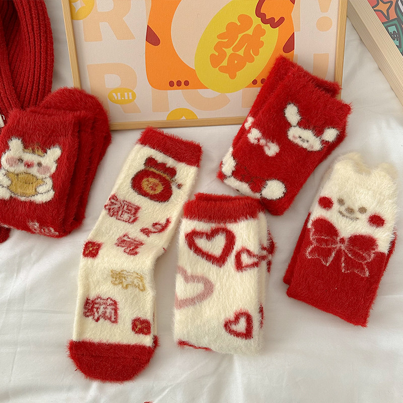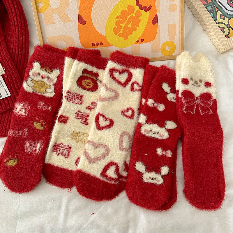 Nut Moms Large Red Water Mink Suede Socks Woman Midbarrel Socks Plus Suede Thickened Warm Rabbit Year Long Socks-Taobao