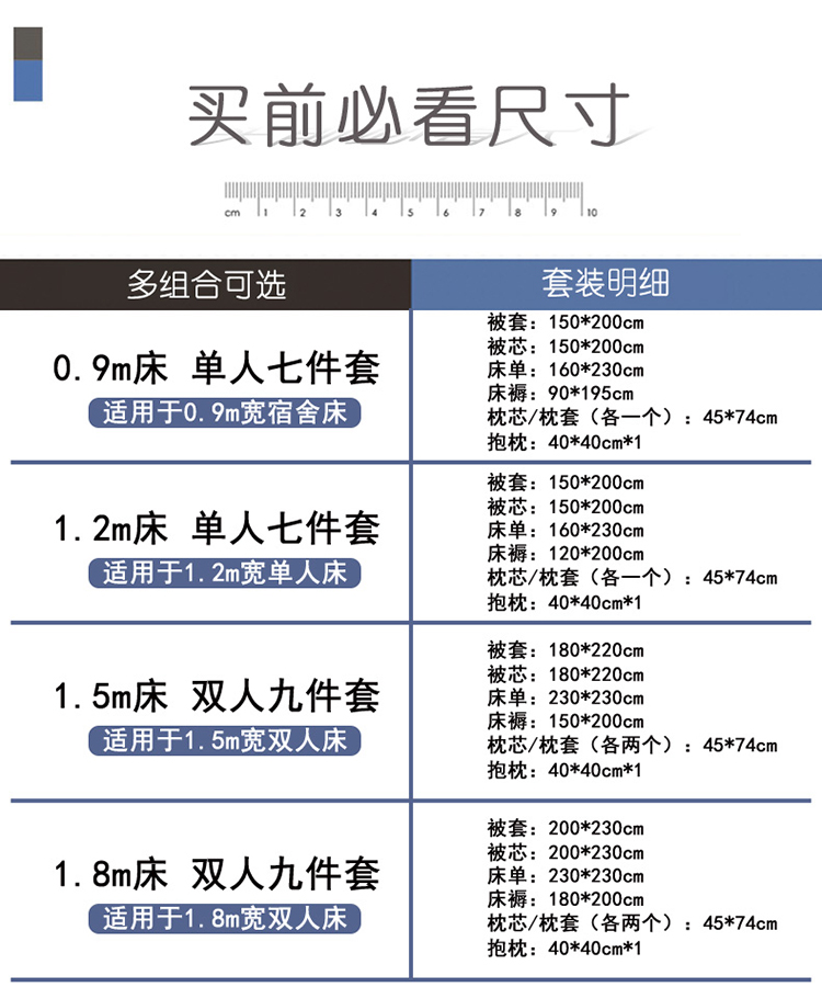 0 9 beds 1 5X2m single thin quilt 3 catties seven-piece set 1 5 beds 1 8X2 2m double winter quilt 6 catties nine-piece set 1 8 beds 2 0X2 3m double spring and autumn 6 catties