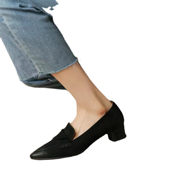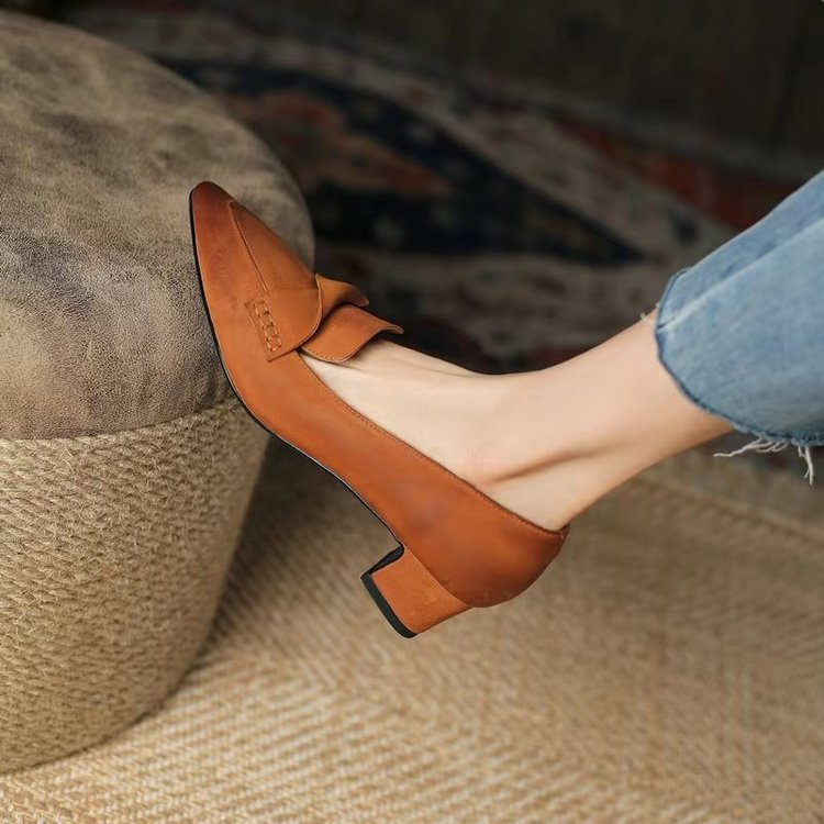 Brown Fasted Single Shoe Woman Custard Coarse Heel Small Leather Shoes Commute Temperament Low Heel Real Soft Leather Shoes
