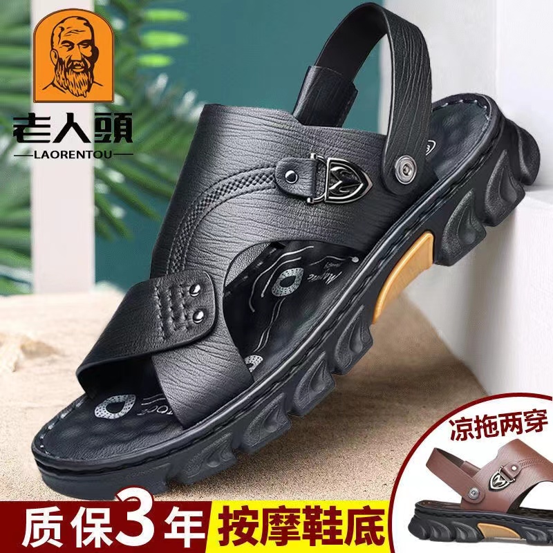 Old man's head sandals men's leather casual beach shoes Men's thick bottom non-slip sandals Breathable Middle-aged Dad Shoes-Taobao
