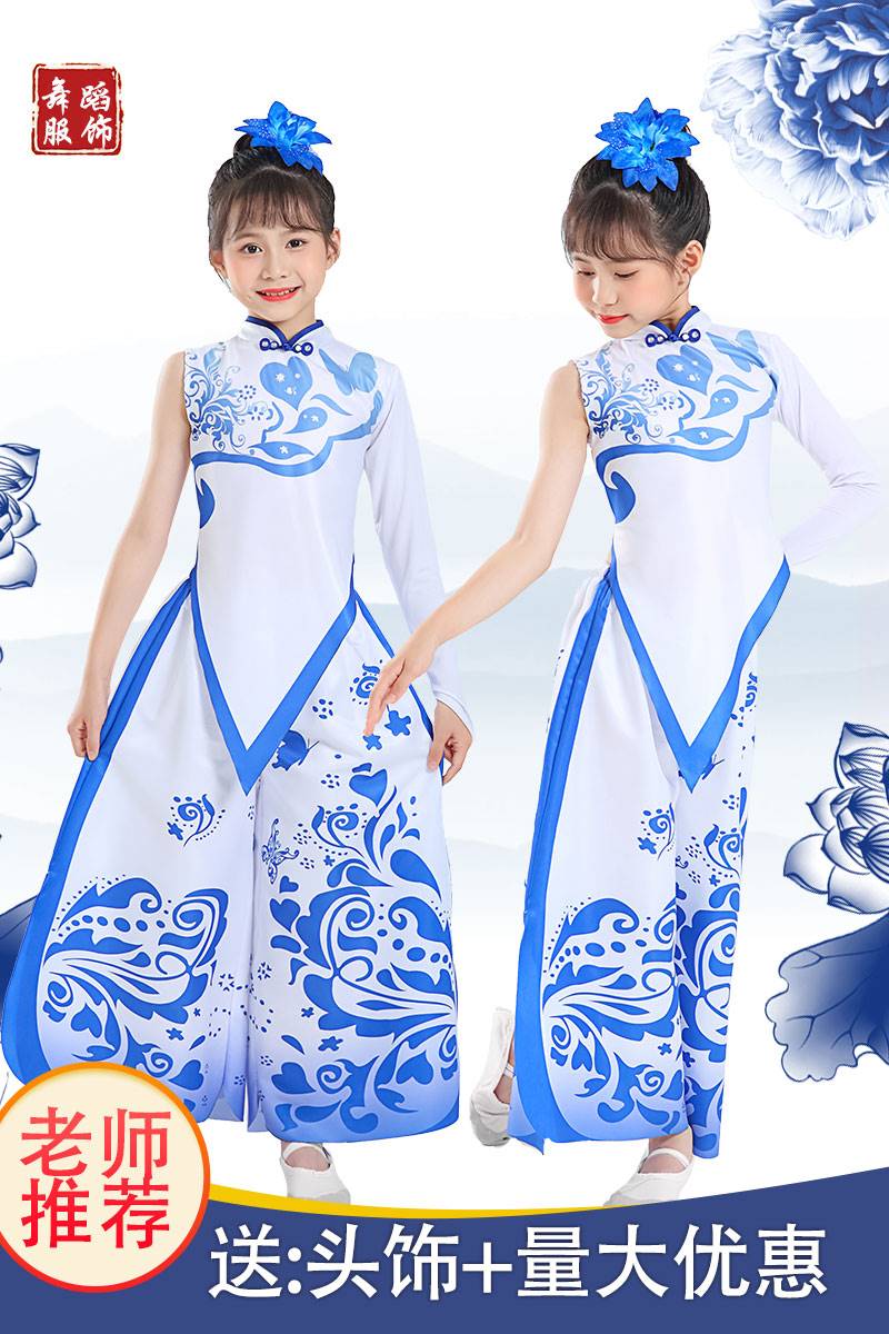 New Children's Handsome Face Classical Dance Show Costume for National Fan Dance Blue Ceramic Performance