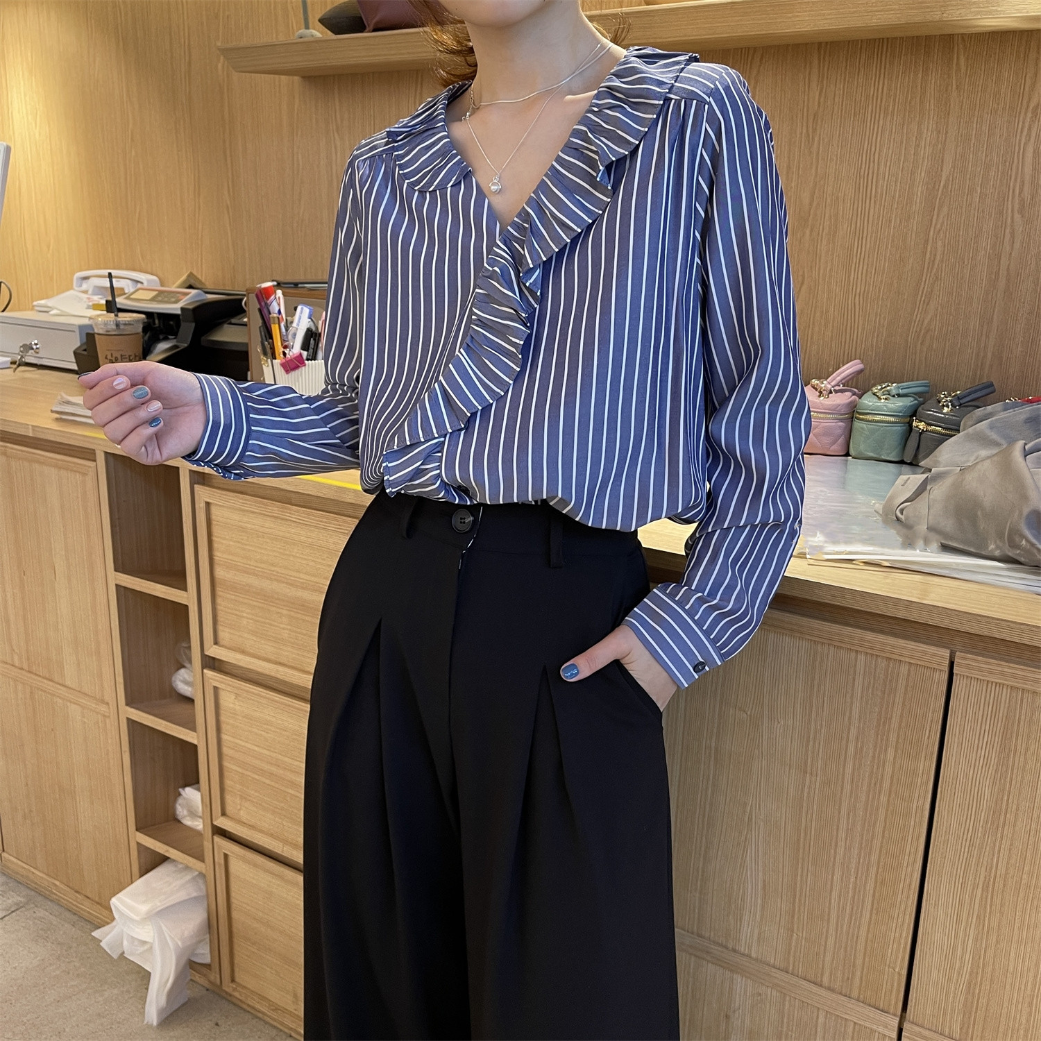 South Korea's wooden ear striped shirt woman in spring 2023 new temperament V - collar design and professional shirt