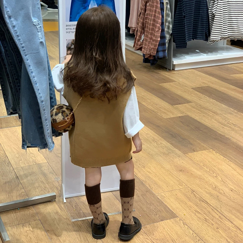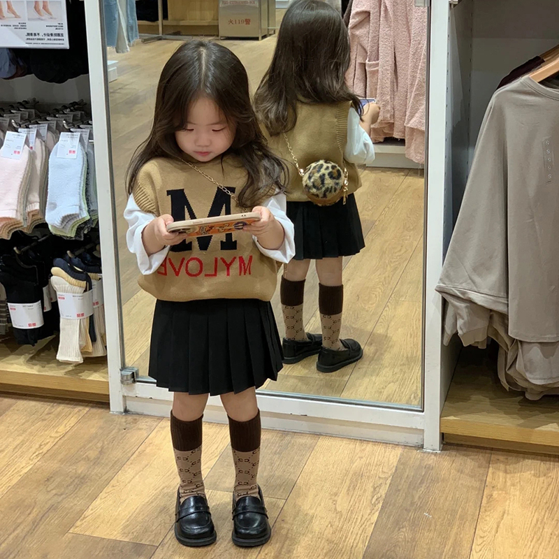 3208 brown M letter knitted vest 2A16 cotton white T-shirt 3210 pearl love black skirt pants 3268 brown double C no heel mid-calf socks one size