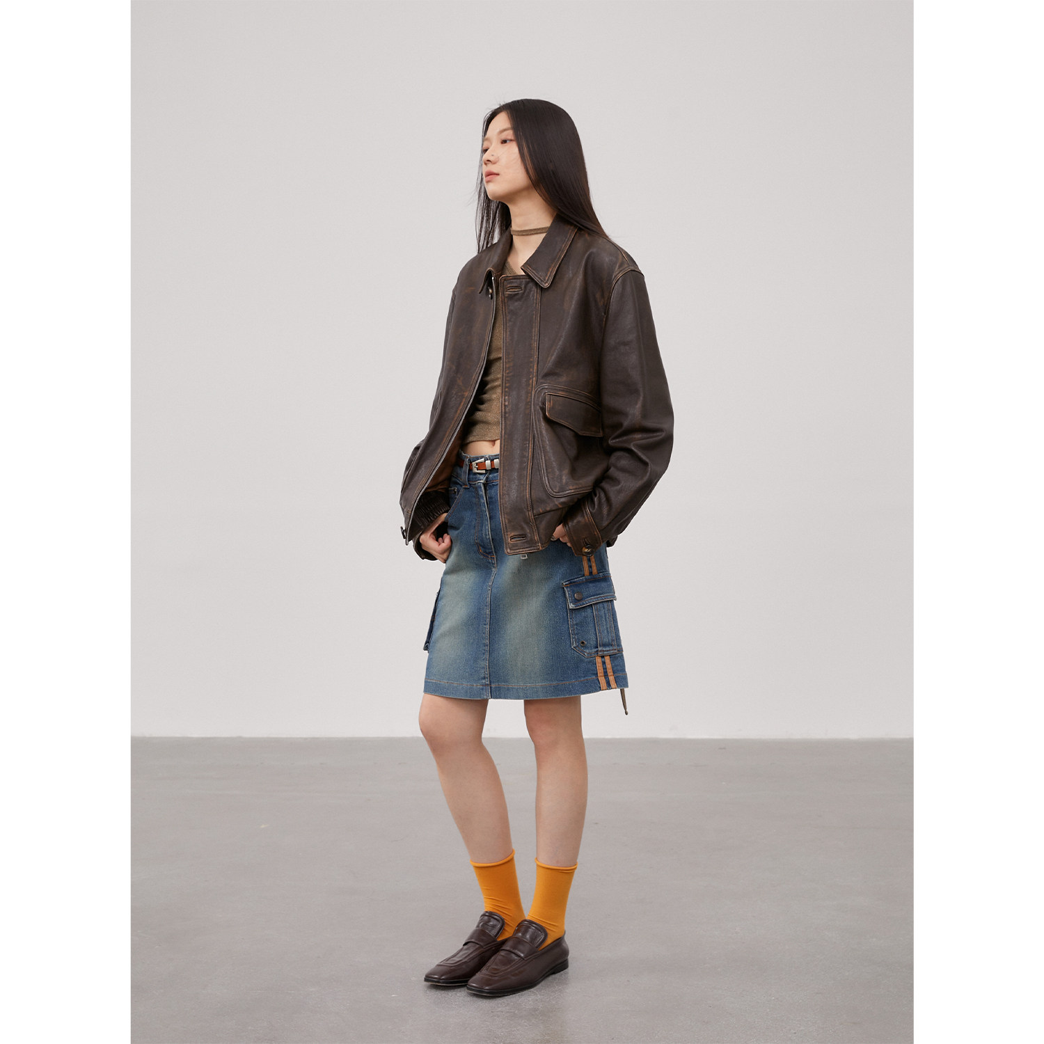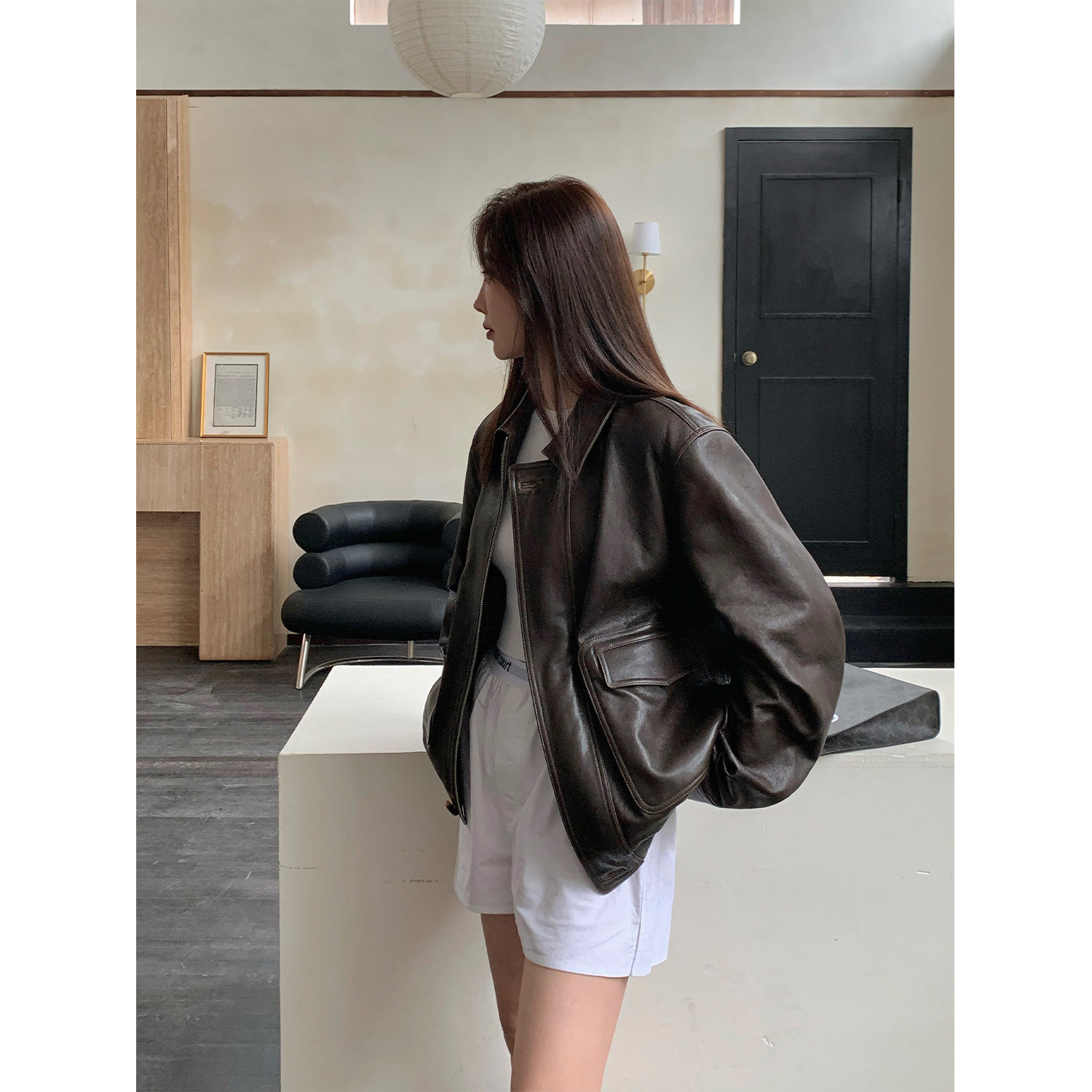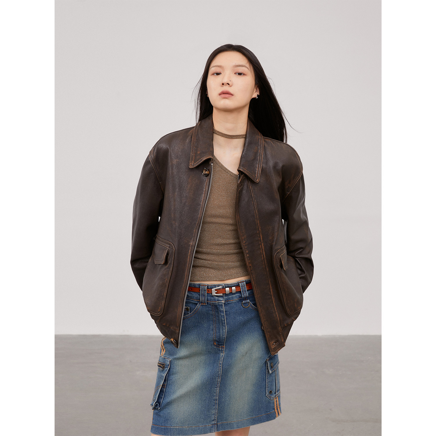 Fu Zhien Nancheng Old Lane Retro Classic Pilot Leather Jacket Small Lapel Leather Leather Coat Female Spring and Autumn