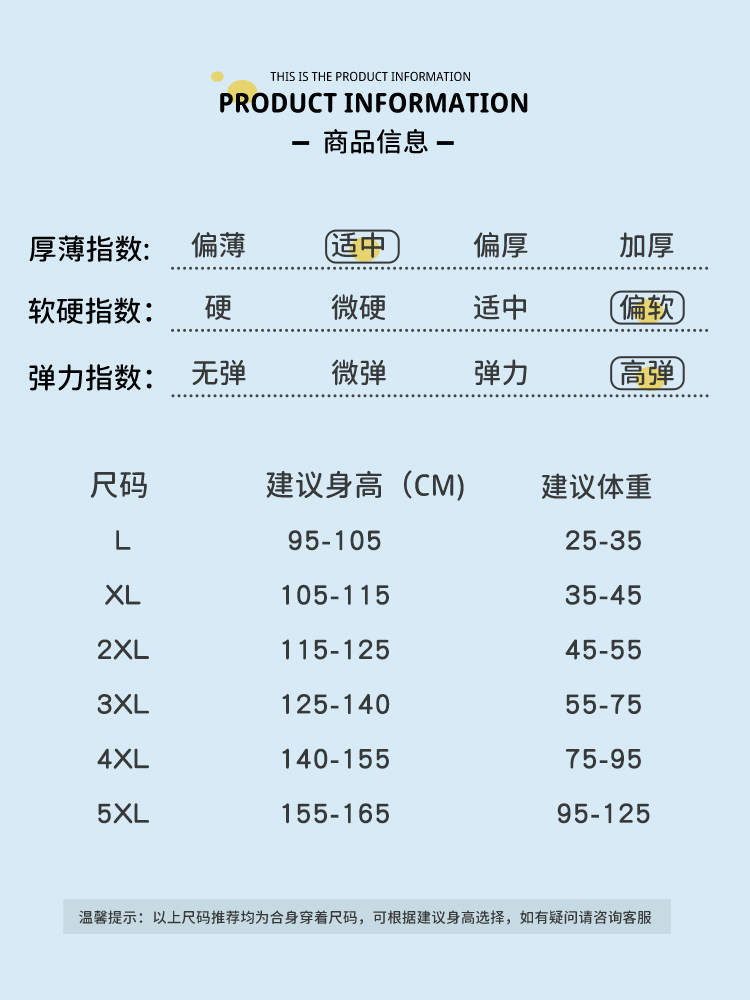 L (recommended height 100-110cm and weight 30-40 catties) XL (recommended height 110-120cm and weight 40-50 catties) 2XL (recommended height 120