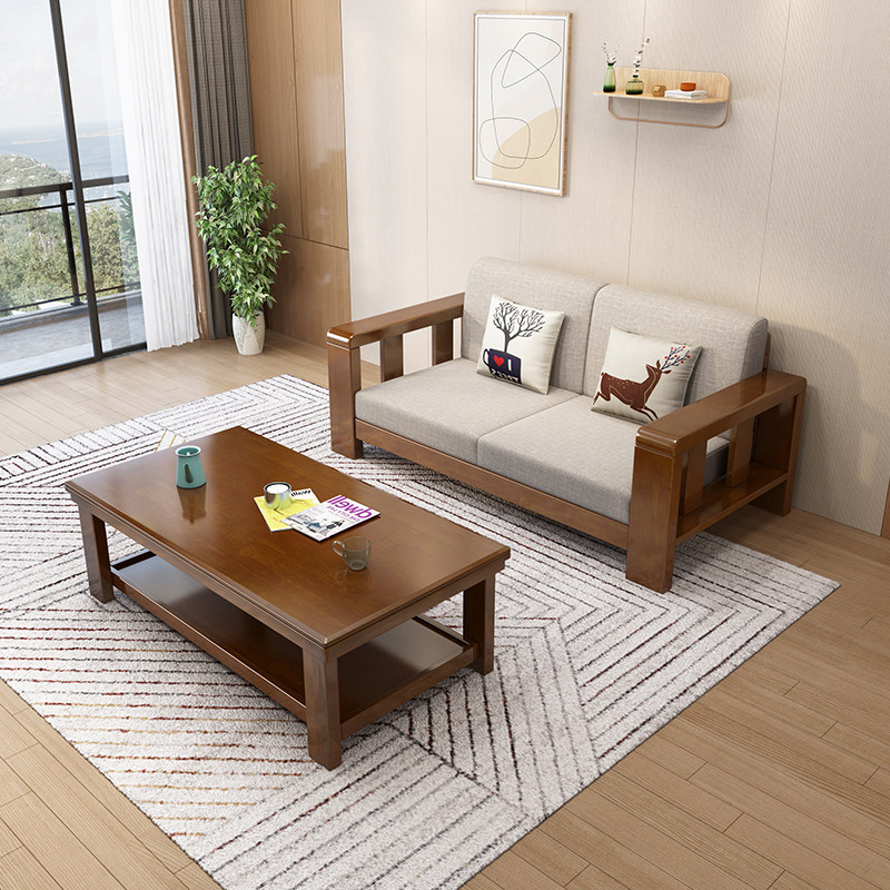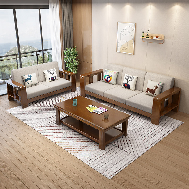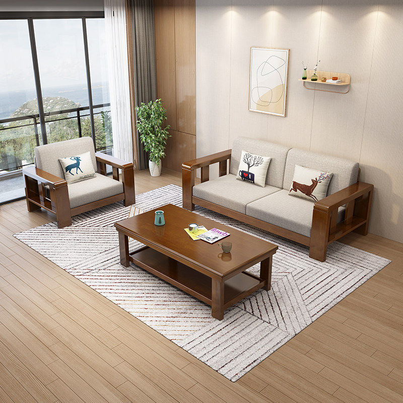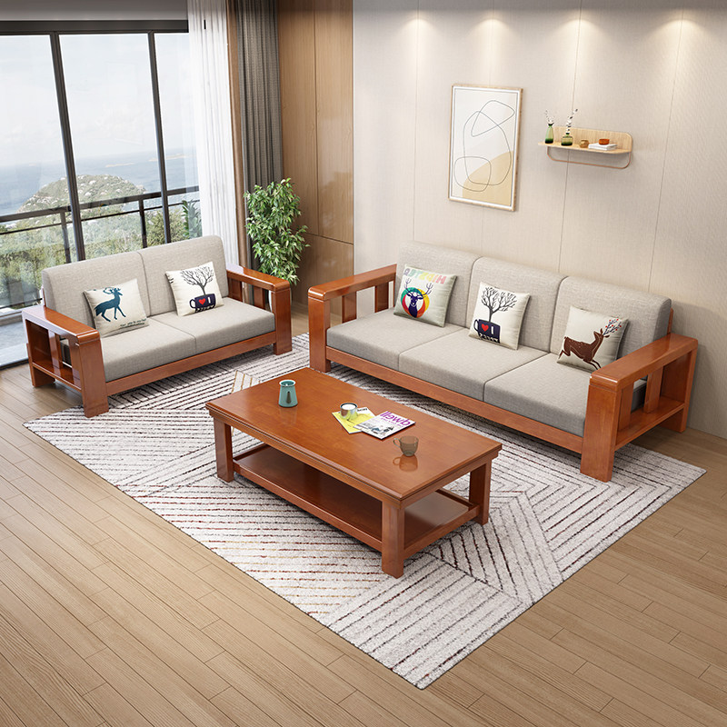 Chinese modern solid wood sofa combination fabric rubber wood economical simple living room furniture small apartment wooden sofa