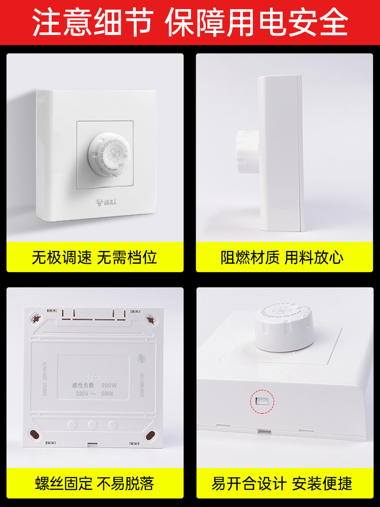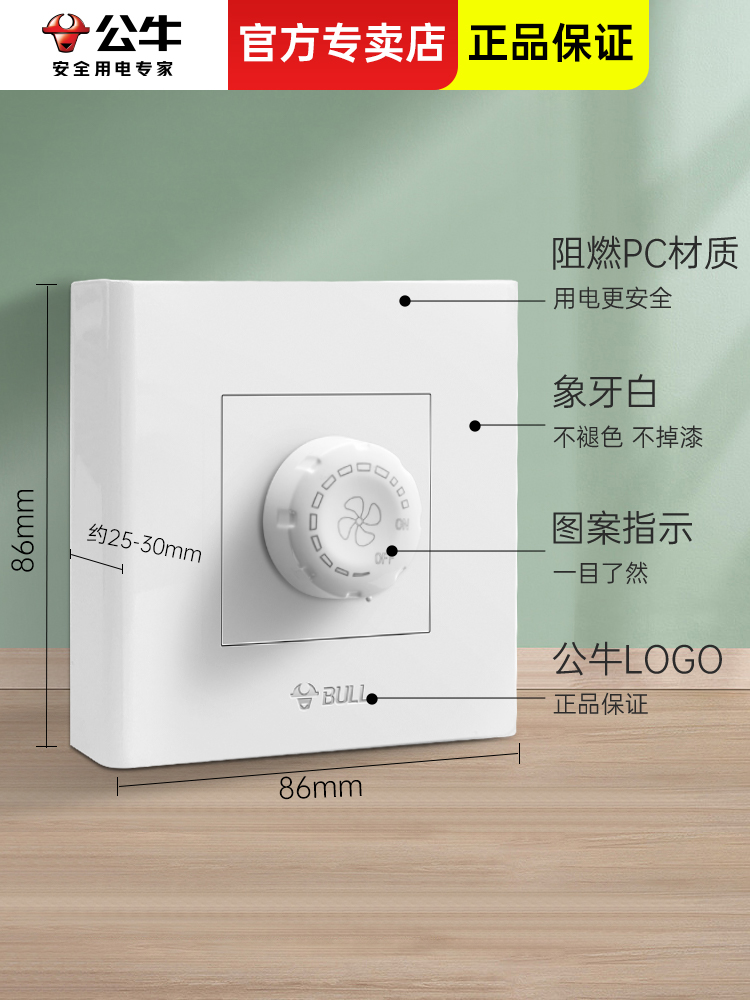 Bull Bright Dress Throttle Switch Fan Ceiling Fan Endless Variable Speed 86 Type Home 220V Electric Fan Knob Speed Governor-Taobao