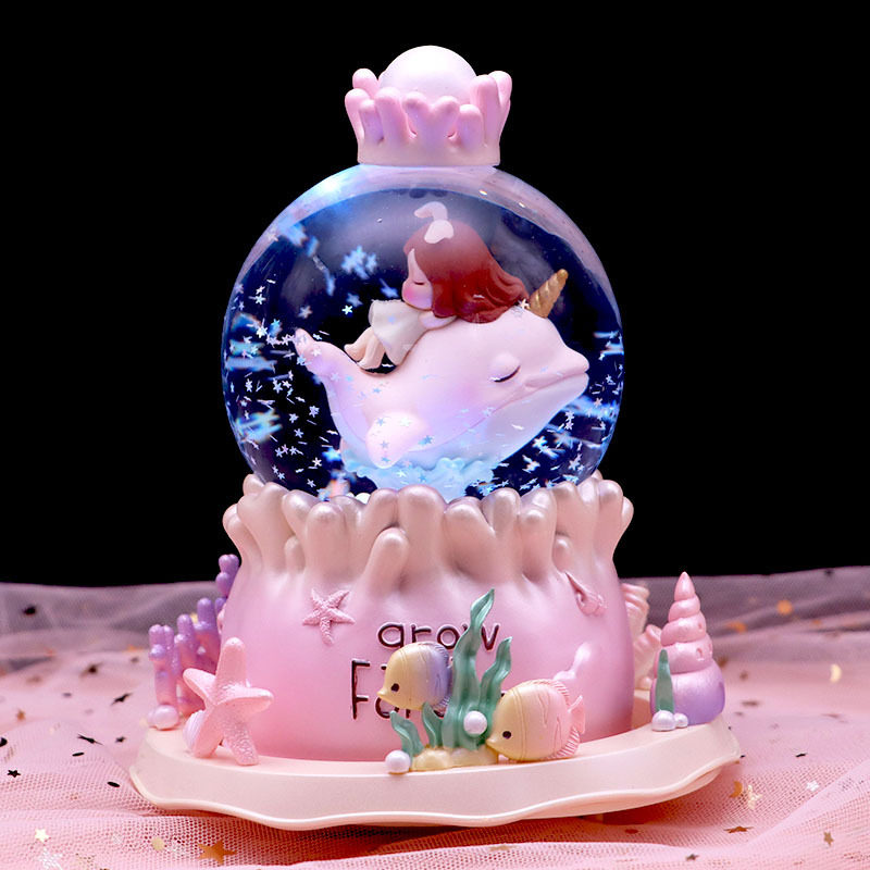 Extra-large dolphin powder Outer rotation Automatic drifting snow Music festoons Dolphin Purple Outer Rotation Automatic Snow Music Color Lights Special Horse-drawn Carriage Dolphin Pink Inner View Spinning Self
