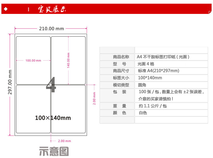 A4 self-adhesive sticker label photocopying paper 100*140mm adhesive paper laser inkjet 4-grid glossy sub-surface fillet