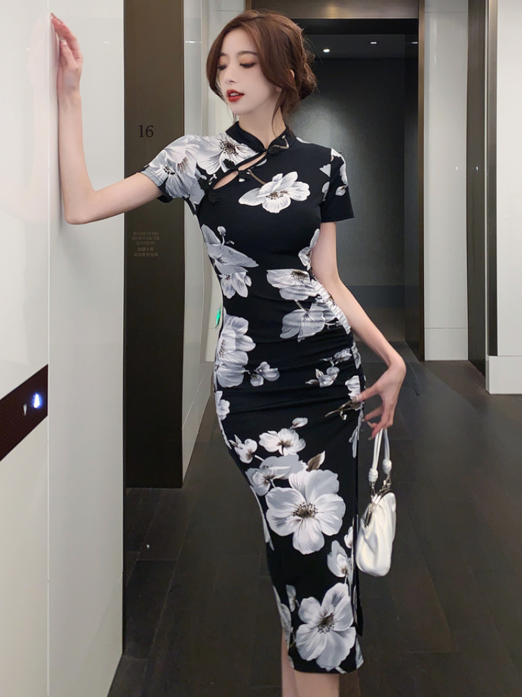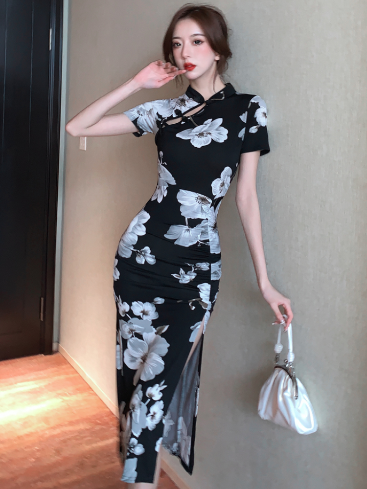 2023 Years Retro State Tide Print Improved Qipao High Open Fork Daily Bag Glutes HIP FOLDS CASHEW IN LONG SECTION DRESS-TAOBAO