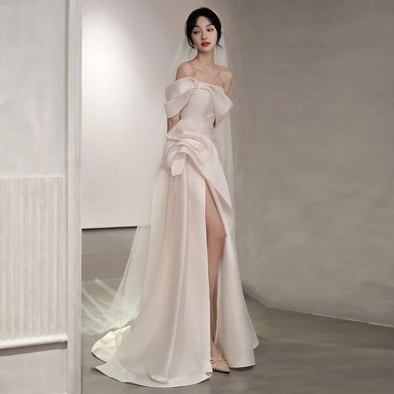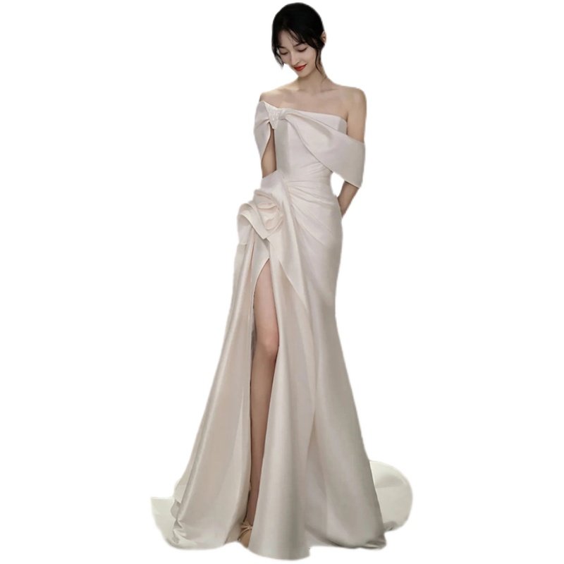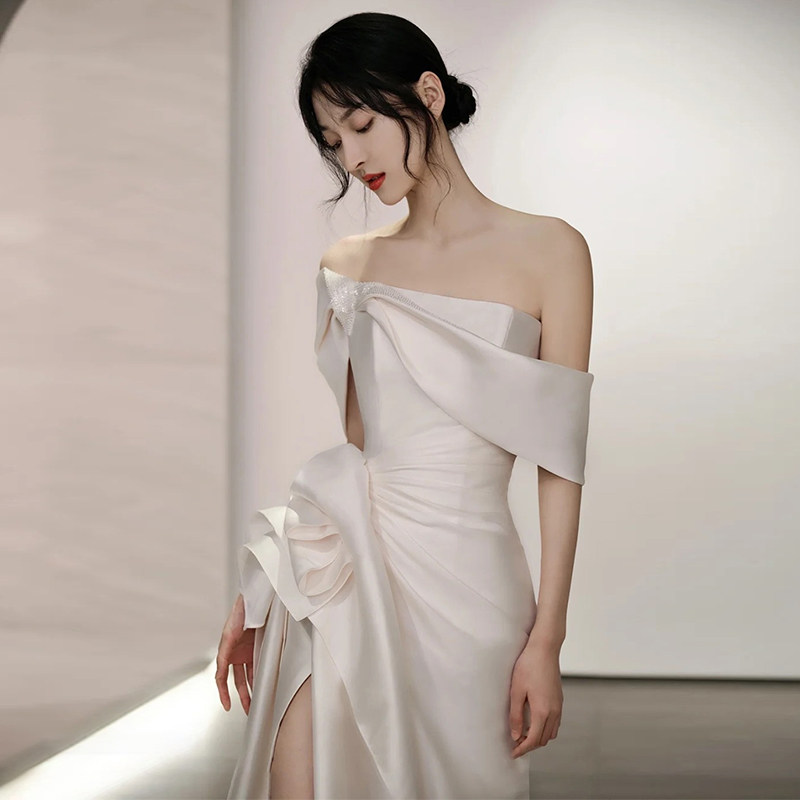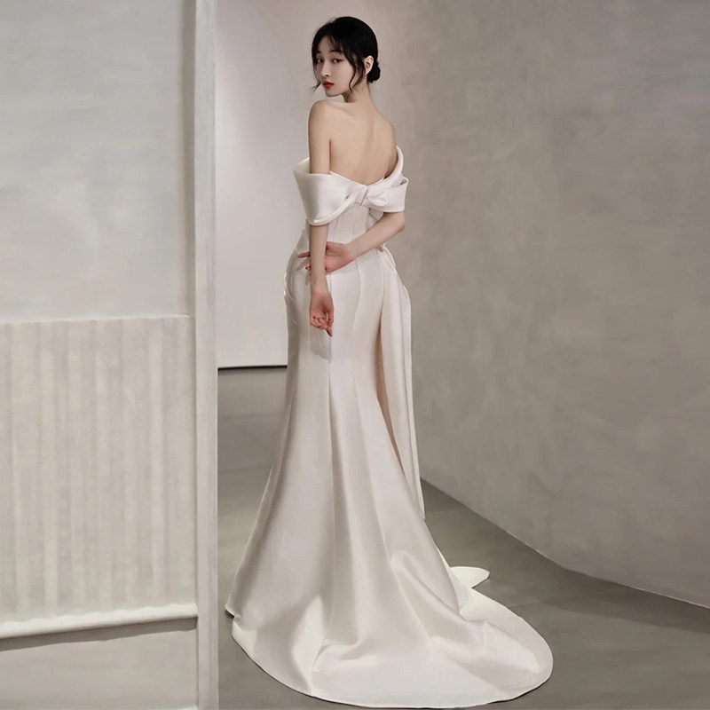 French satin word shoulder wedding dress white minimal temperament fishtail outdooryarn bride welcome evening dress